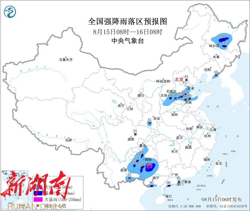 预计,8月15日8时至16日8时,黑龙江中南部、辽宁东部、北京东北部、河北南部、天津中南部、山西中部、陕西南部、贵州中西部和南部、云南东部、广西西部和南部沿海、广东西南部沿海等地部分地区有大到暴雨,其中,贵州南部、广西西北部、河北南部等地局地有大暴雨(100~150毫米) 。上述部分地区伴有短时强降水(最大小时降雨量20~50毫米,局地可超过70毫米),局地有雷暴大风或冰雹等强对流天气。