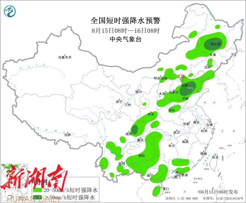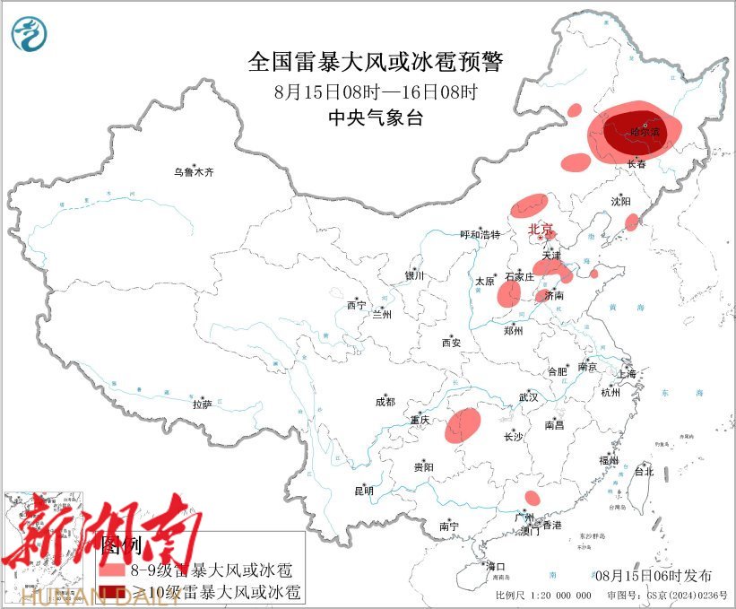 预计8月15日8时至16日8时,内蒙古中东部、东北地区中西部、华北、西南地区东部、华中西南部、山东北部、华南北部等地的部分地区将有8级以上雷暴大风或冰雹天气,其中,黑龙江南部、吉林西北部等地的部分地区将有10级以上雷暴大风,最大风力可达11级以上 ;内蒙古中东部、东北地区、华北、西北地区东南部、华中北部和西南部、山东北部、西南地区中东部、华南等地的部分地区将有小时雨量大于20毫米的短时强降水天气,其中,黑龙江南部、吉林西北部、河北东南部、天津南部、山东西北部、四川东部等地的部分地区小时雨量大于50毫米,最大可达70毫米以上。