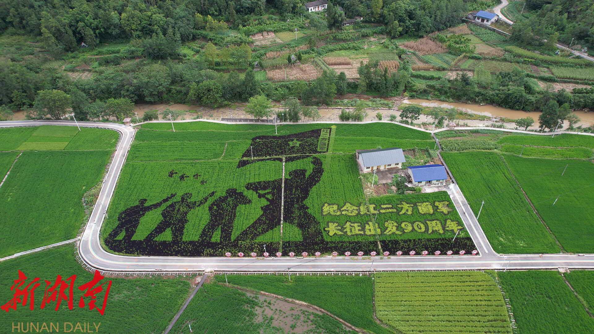 在优质稻种植基地,彩色水稻以红色文化、少数民族等元素为主题,将红、紫、黄、绿等多种颜色巧妙搭配,在无人机俯瞰下,栩栩如生的红军长征图、少数民族欢歌载舞图清晰呈现。千亩彩色稻田环绕游步道分布,形成了一条“沉浸式田园景观带”,如天然调色板“镶嵌”在青山环抱的田野中,与远山、村庄交相辉映。