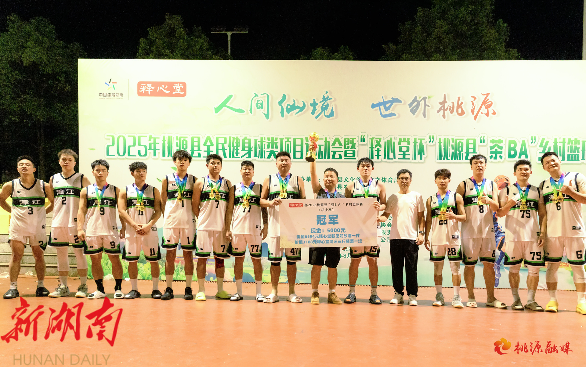 桃源融媒8月17日讯(记者:彭伟桐 戴鹂慧(见习) ) 8月16晚,2025年桃源县全民健身球类项目运动会暨“释心堂杯”桃源县“茶BA”乡村篮球赛落下帷幕。本次篮球赛历经11天的激烈角逐,30支球队共进行了96场精彩赛事,为观众呈现了一场场篮球视觉盛宴,最终漳江街道队以卓越表现夺得总冠军桂冠。