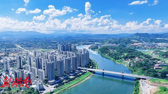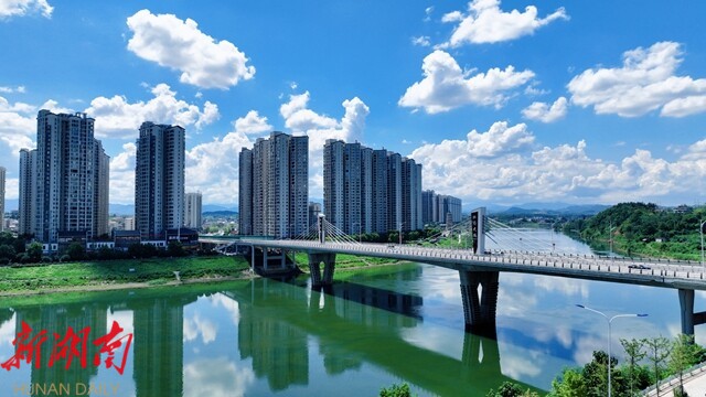 (蓝天白云与城区的高楼、绿树、资江碧波相映成趣,勾勒出一幅清新明快的城市生态画卷。龚端翔 摄)