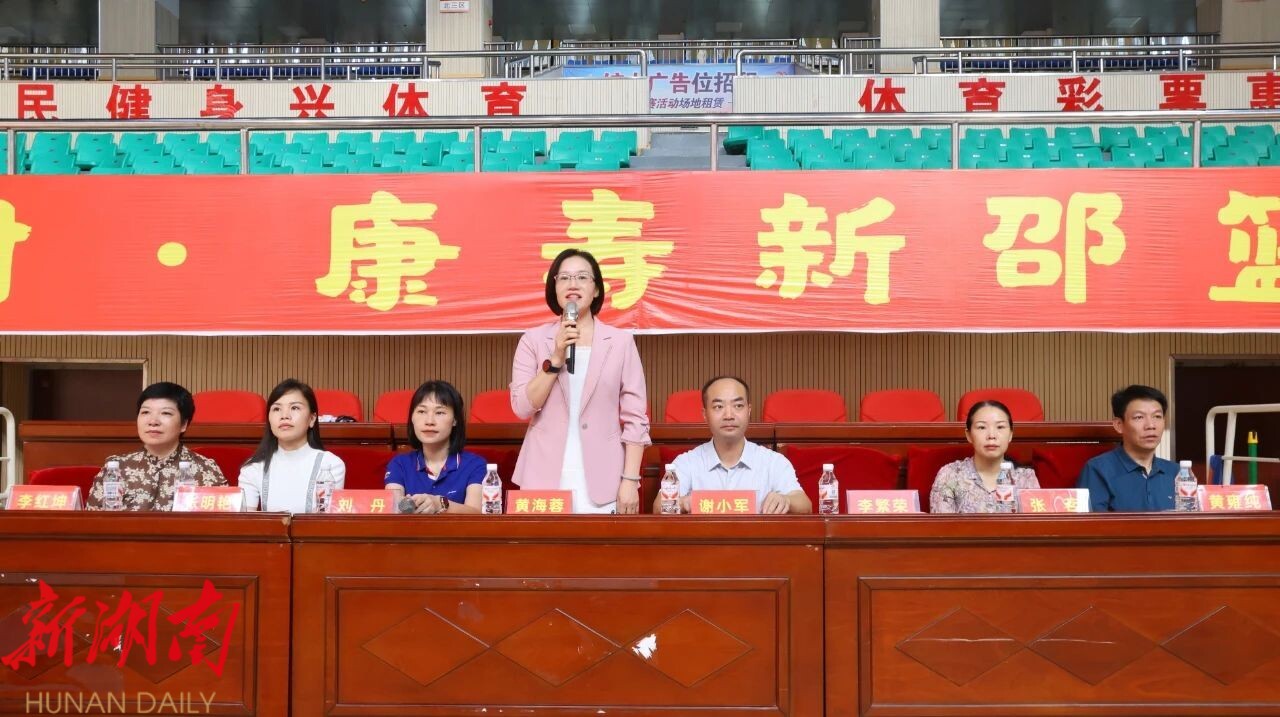 新新邵客户端8月18日讯(记者 屈凌芙蓉 唐文峰 陈望远)八月的新邵,热浪与激情撞了个满怀!8月18日,新邵体育馆内人声鼎沸、掌声雷动,2025年新邵县第三届“和美乡村·康寿新邵”篮球比赛(村BA)在此拉开战幕。县委书记黄海蓉出席并宣布大赛开幕,县委副书记、县长谢小军出席并致开幕词,县委常委、副县长李繁荣主持开幕式。县领导刘丹、张明艳、张茗等参加。