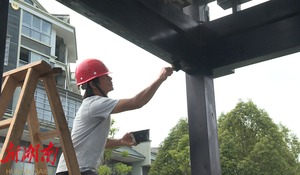 中方融媒8月19日讯 (记者:谭莹莹)8月19日,在中方县中方大道两旁的文明岗亭内,施工人员正手持毛刷蘸取黑色外墙漆,沿着柱子边缘细致涂刷,给文明岗亭换上“新装”。
