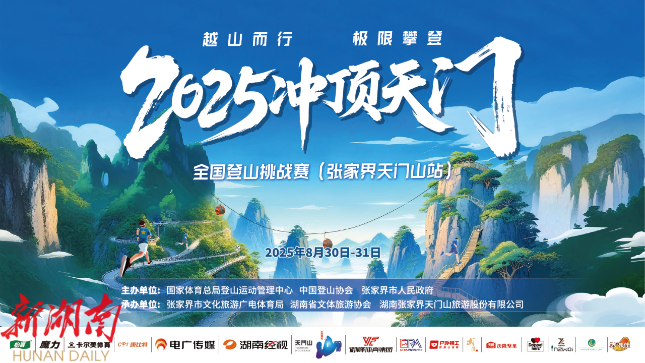 8月30日至31日,2025“冲顶天门”全国登山挑战赛(张家界天门山站)将在张家界天门山景区举行。上千名来自不同领域的顶尖跑者与挑战者将齐聚于此,在险峻赛道上角逐“冲顶天门登山王”。