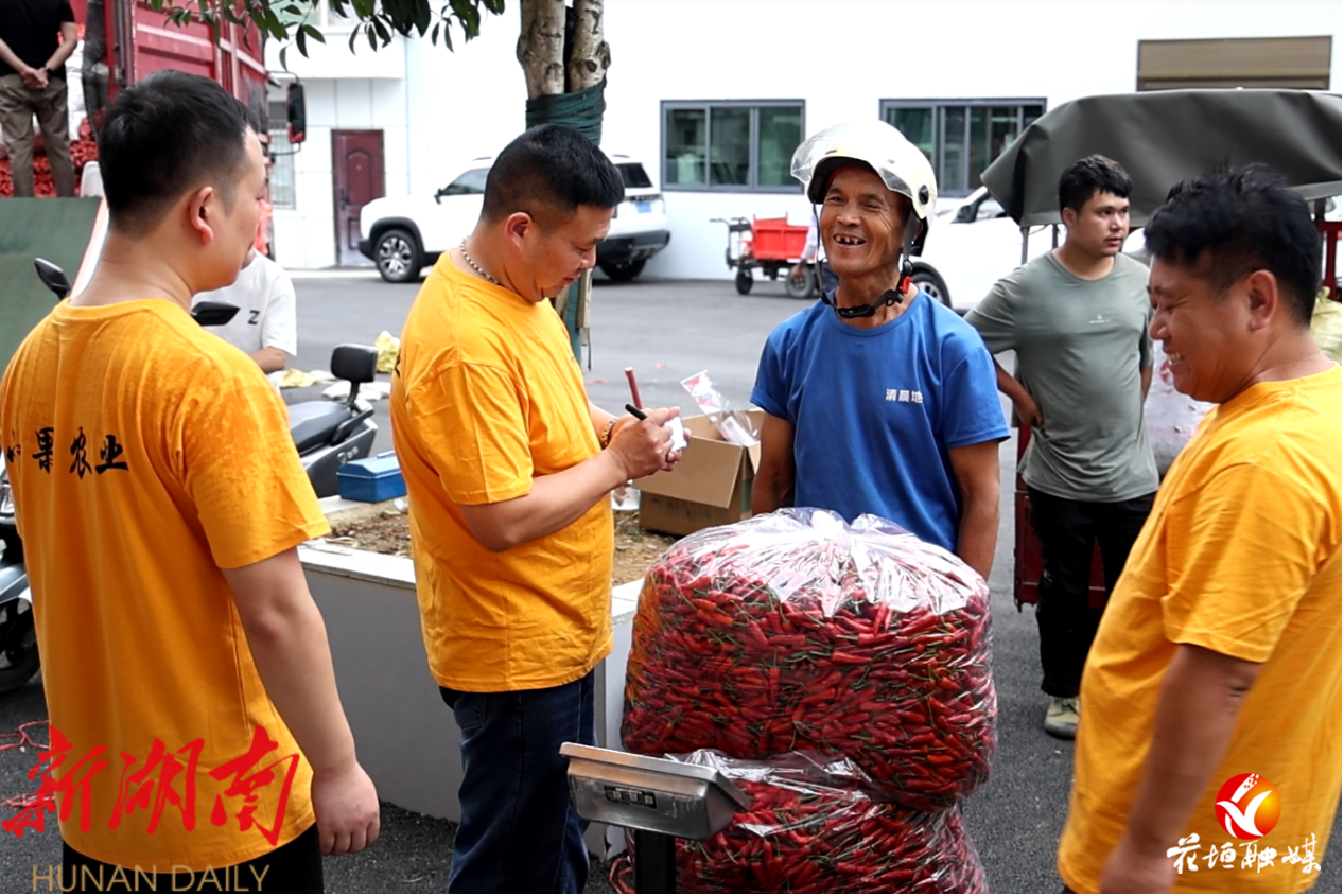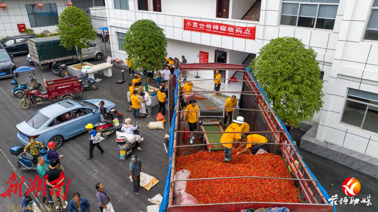 湖南日报·新湖南客户端8月19日讯(通讯员 吴向申 吴思齐) 当前正值辣椒采收旺季,8月18日,在位于花垣县双龙镇排碧村的湘西小果农业科技发展有限公司辣椒收购点,满载辣椒的三轮车一辆接着一辆从村口缓缓驶入。车停稳后,小果农业的工作人员连忙上前帮村民将一袋袋辣椒从车上卸下,火红而繁忙的景象在收购点成了一抹亮丽的风景线。