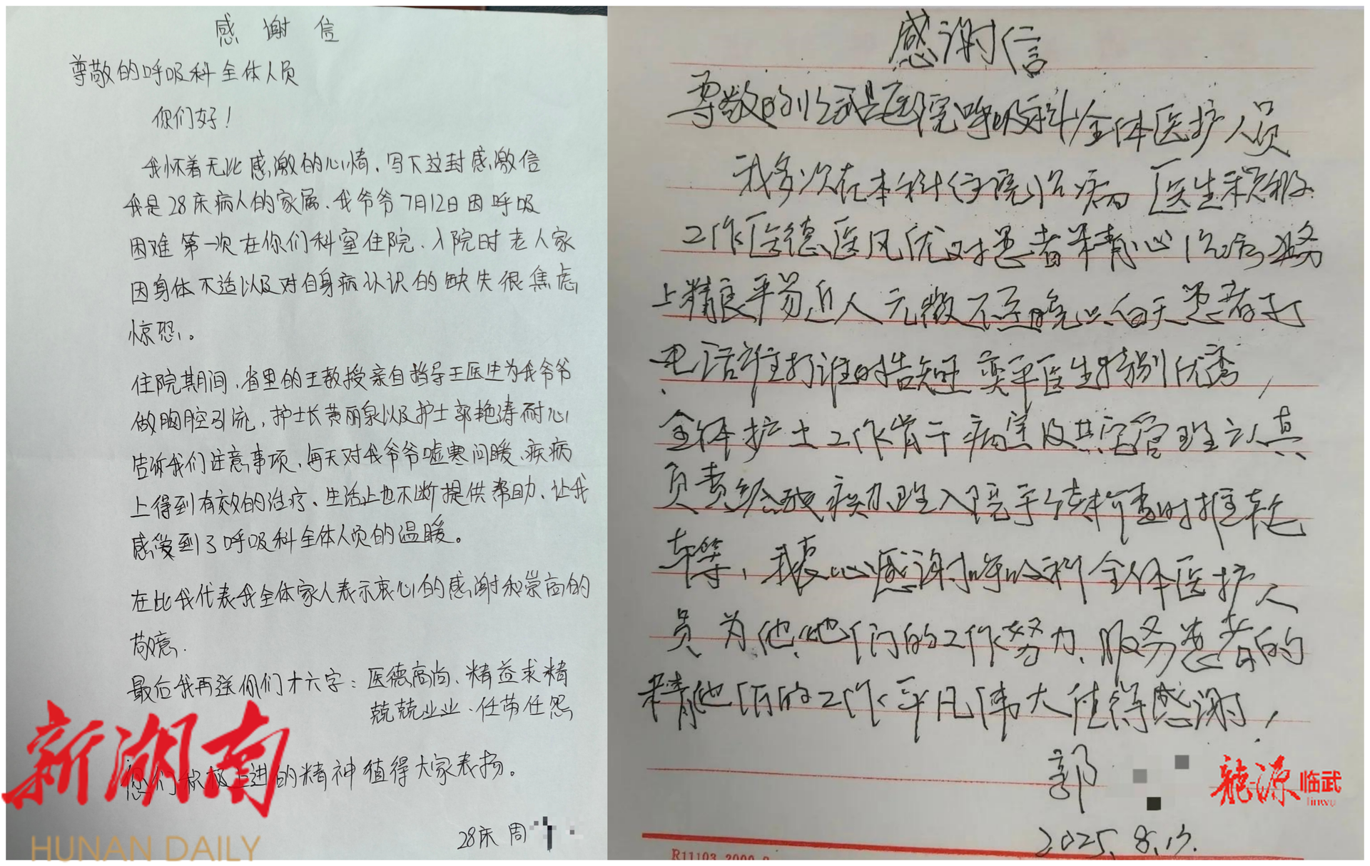 龙源临武客户端8月19日讯(通讯员 刘丹 黄舒翼)近日,临武县人民医院呼吸与危重症医学科接连收到2封感谢信,信中文字质朴,情真意切,饱含着患者及家属沉甸甸的感激,更映射出该科在精湛医术和暖心服务上,双重深耕收获的信任与赞誉。