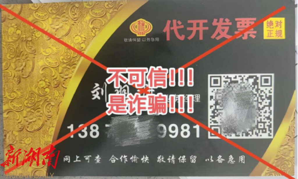 湖南日报·新湖南客户端8月20日讯(通讯员 邹民 李青 张荣军)近日,零陵区纳税人蔡女士因轻信公司前台发现的“代开发票”名片,扫描二维码添加“客服经理”微信后,向其个人账户支付了所谓的“劳务费”和“税款”代开了一张发票。然而,后续办理业务时却发现该发票在税务系统中无记录,且“客服”已将其拉黑。经税务局鉴定,蔡女士收到的是一张伪造发票,钱财发票两空。
