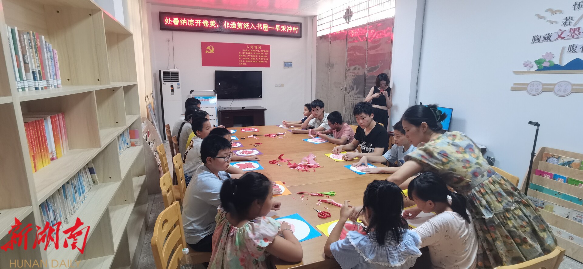 湖南日报·新湖南客户端8月21日讯(通讯员 周杰) 8月20日上午,祁阳市七里桥镇早禾冲村农家书屋内,二十余名孩子正围坐在长桌旁,手握彩纸与小剪刀,在联村志愿者老师的耐心指导下,兴致盎然地参加剪纸手工制作活动。