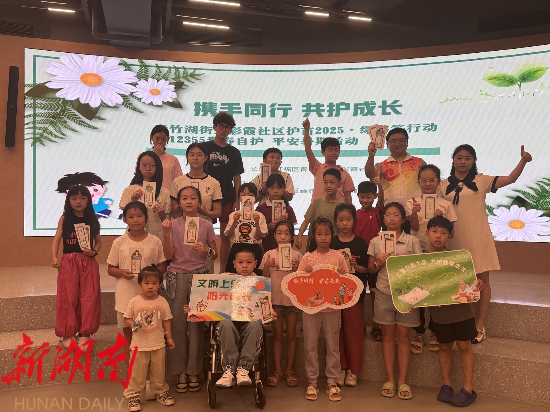 湖南日报·新湖南客户端8月21日讯(通讯员 邬妙)为深入落实“护苗2025”专项行动部署,切实保障未成年人的合法权益,8月21日,在共青团湖南省委,长沙市第一医院、长沙市仁一红丝带健康促进中心的指导支持下,长沙市开福区青竹湖街道彩霞社区联合行知书屋、长沙市开福区臸诚社会工作服务中心开展”携手同行 共护成长”——护苗2025绿书签行动暨12355青春自护 平安暑期活动,40余名社区儿童及其家长参与。