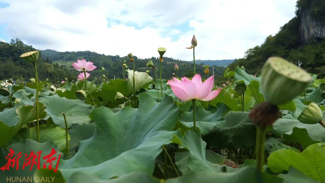 天上无人机在飞,荷塘里则是村民们忙碌采摘莲蓬,他们头戴遮阳帽,娴熟地穿梭在荷塘中。一片片荷叶,一朵朵莲花,一个个莲蓬,还有忙碌的村民,山间呈现出一派映日荷花别样红的场景。