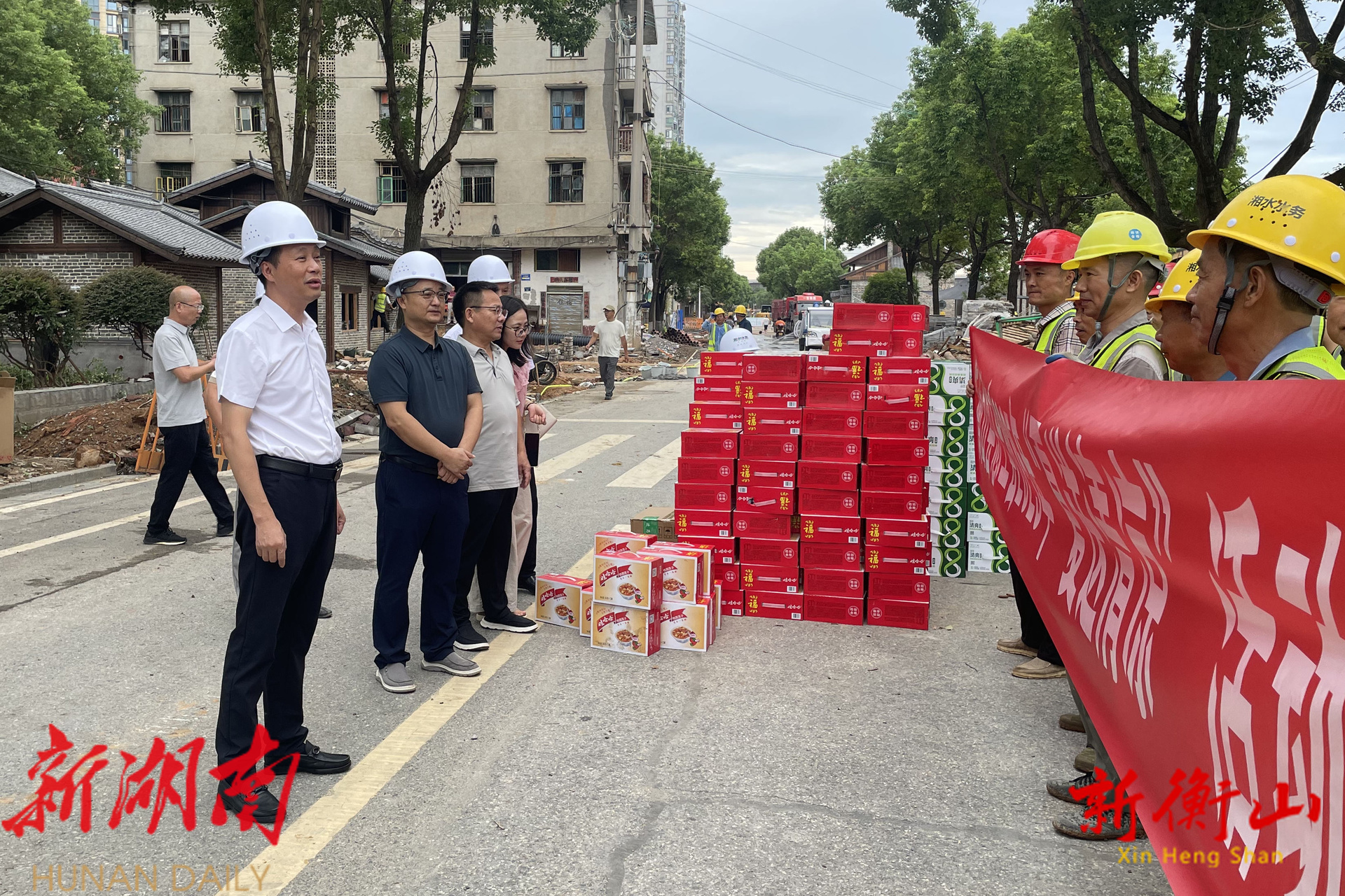 在衡山渡和萱州虎园建设现场,机械轰鸣、施工正酣。建设者们奋战在各自岗位,确保项目按期推进。戴新贤一行来到工地为工人们送上八宝粥、凉茶、藿香正气水等防暑物资,亲切与工人们交谈,感谢大家用汗水为衡山发展添砖加瓦。