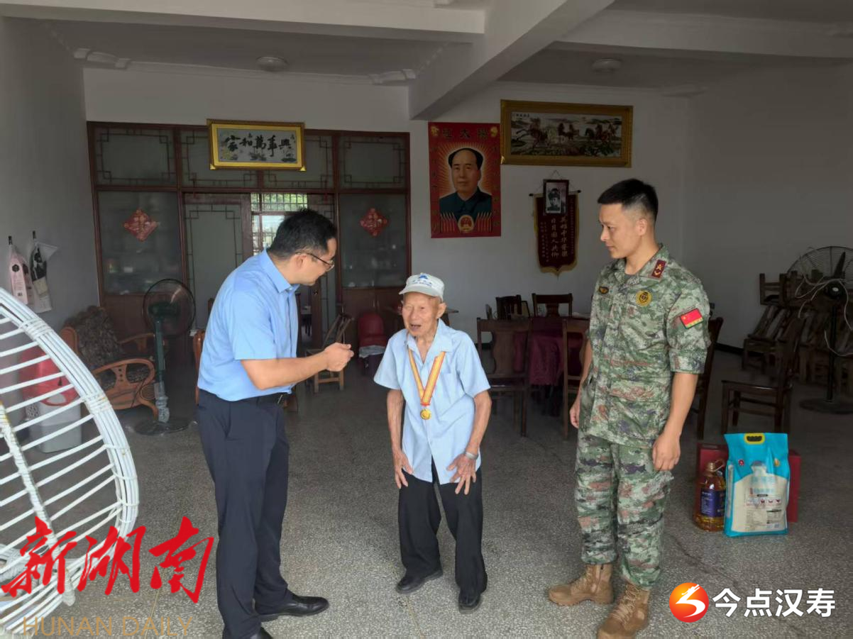 汉寿融媒8月22日讯 (通讯员:高升)8月22日,在抗日战争胜利80周年纪念日即将来临之际,岩汪湖镇武装部联合镇退役军人服务站工作人员走访慰问抗战老兵朱涛。