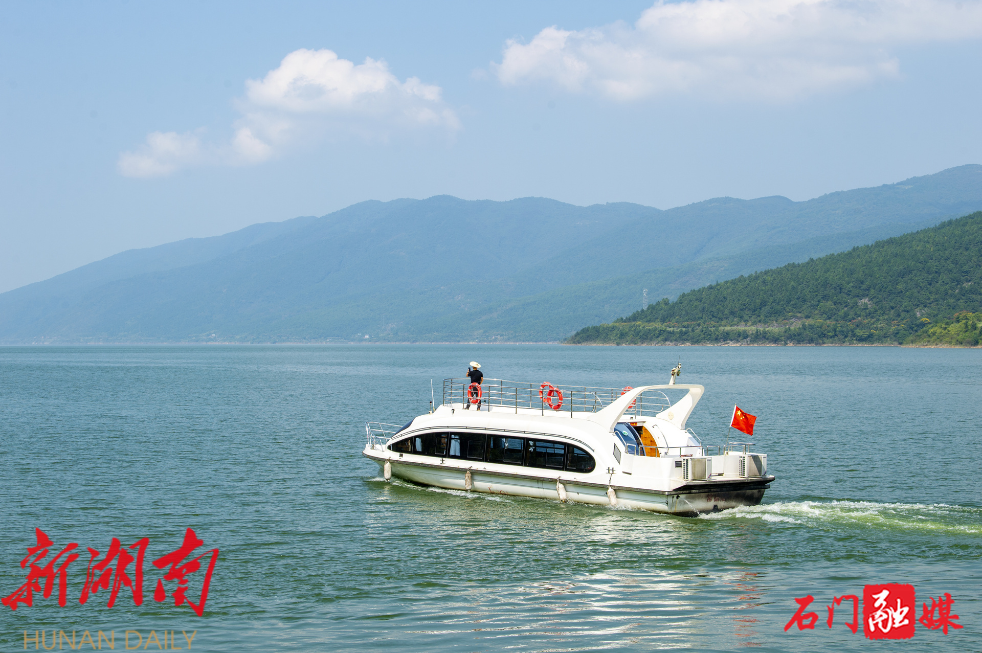 仙阳湖是此次打卡的最后一站。作为湘西北最大的人工湖泊,仙阳湖水域面积达54平方公里,有大小岛屿和半岛100余处,山水相映,构成“船在水中行,人在画中游”的迷人景色。世界旅游小姐们登船远眺,微风拂过湖面,波光粼粼间尽显湖景的静谧与壮阔。