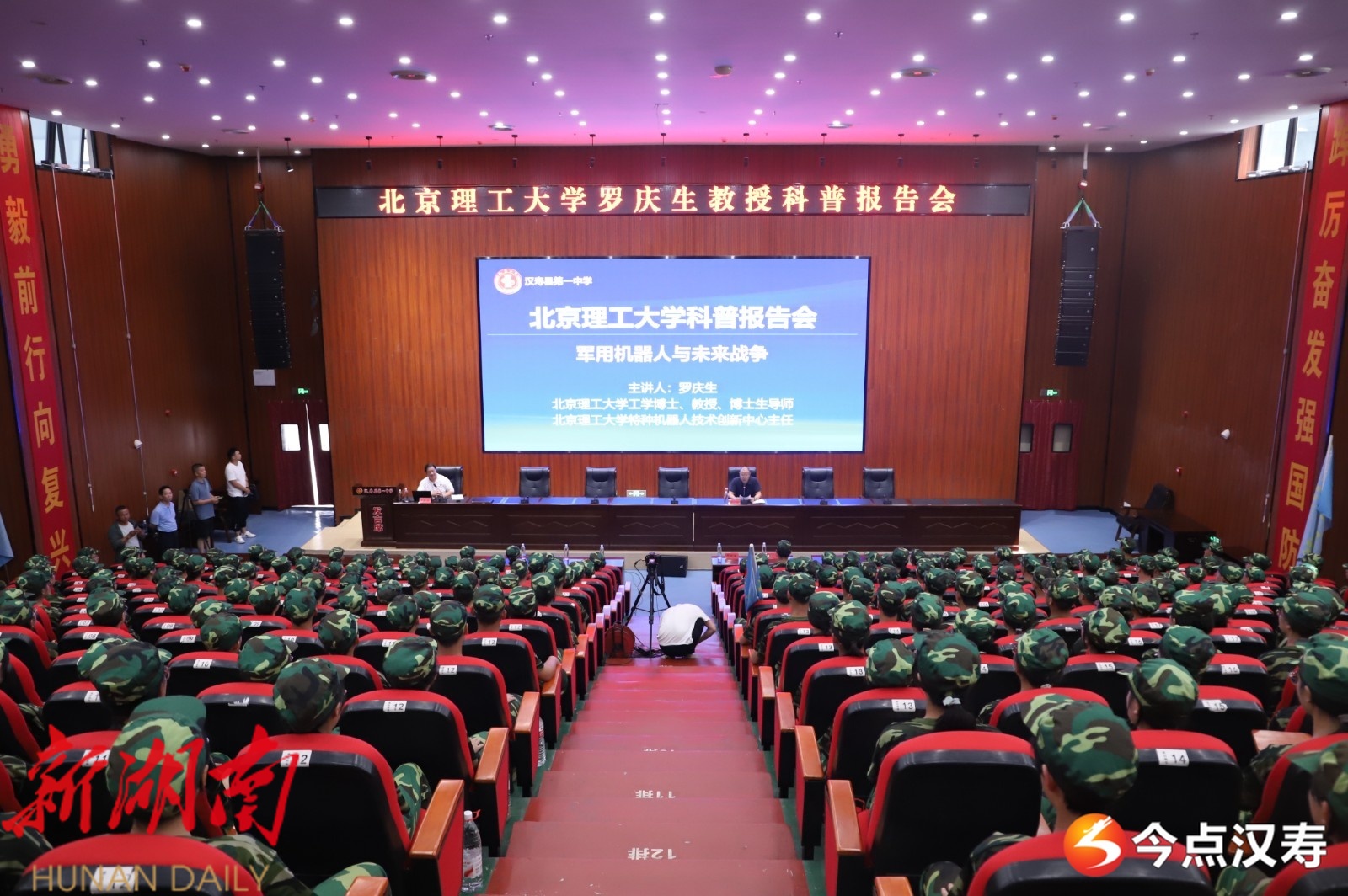 汉寿融媒8月25日讯 (通讯员:陈雨欣)8月24日,北京理工大学罗庆生教授应邀在汉寿一中崇高楼报告厅作《军用机器人与未来战争》专题科普报告。本次活动通过线上直播覆盖全校师生,在新生军训期间别具国防教育意义。