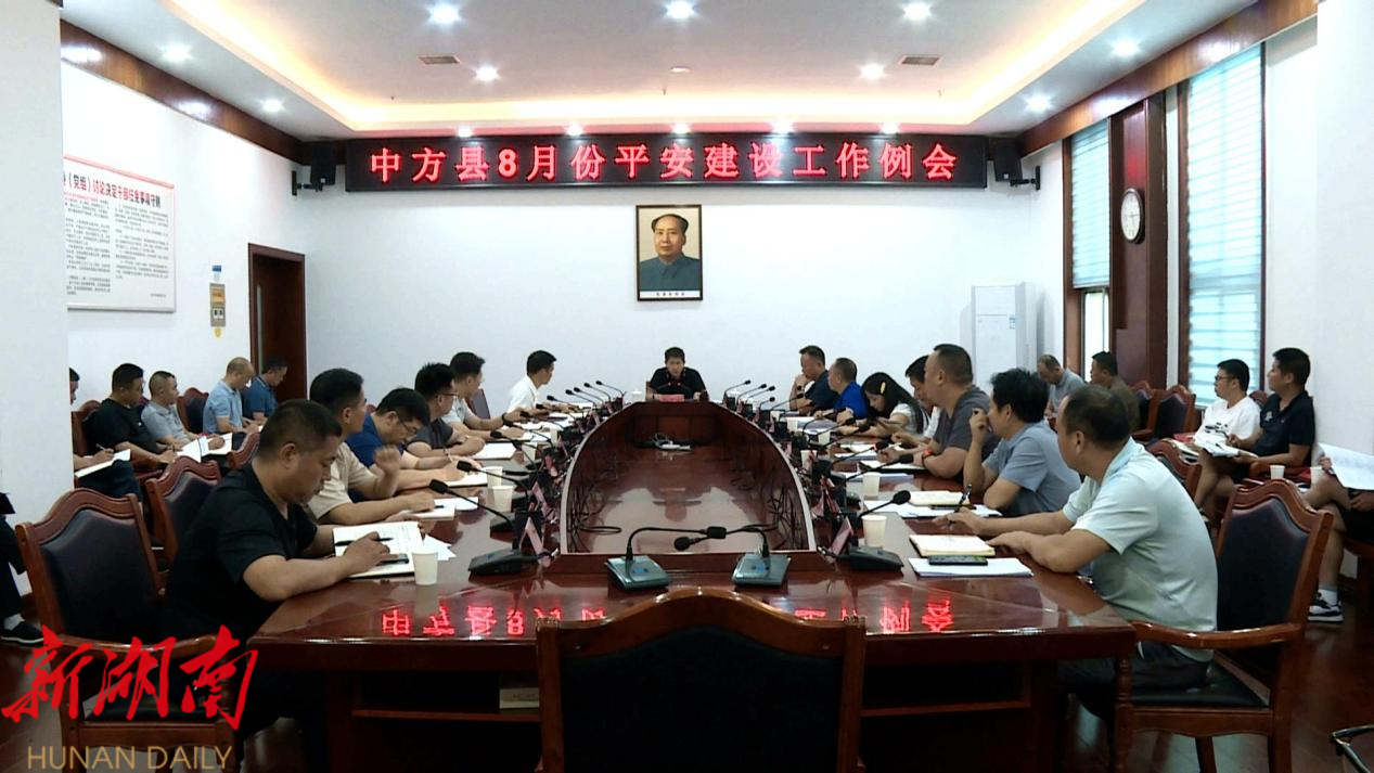 中方融媒8月25日讯 (记者:张言) 8月22日,中方县8月份平安建设工作例会在县行政中心五号会议室召开,县委常委、县委政法委书记杨春斌,县法院院长黄翔、县检察院检察长米久松及相关县直单位、乡镇负责人参加会议。