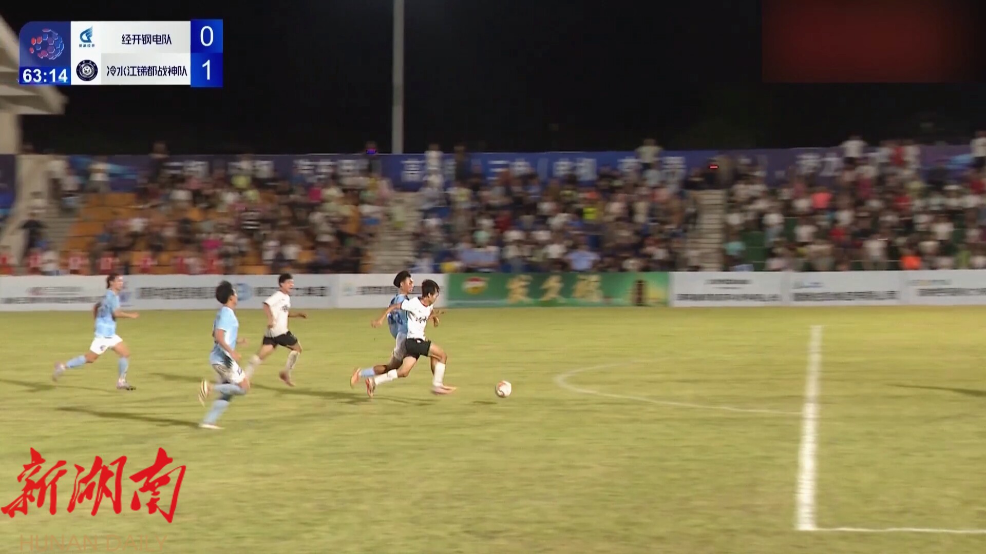 下半场,冷水江锑都战神队抓住机会,69号球员姜羽轩在后场断球后冷静推射破门,足球直蹿网窝,打破僵局。落后的娄底经开钢电队攻势更盛,尤其是最后20分钟,球队频频通过边路传中、中路渗透发起猛烈冲击,可惜射门要么越过横梁,要么被客队防守球员或门将紧急化解,尽管加时8分钟,但始终未能扳平比分,最终,冷水江锑都战神队以1:0客胜娄底经开钢电队。