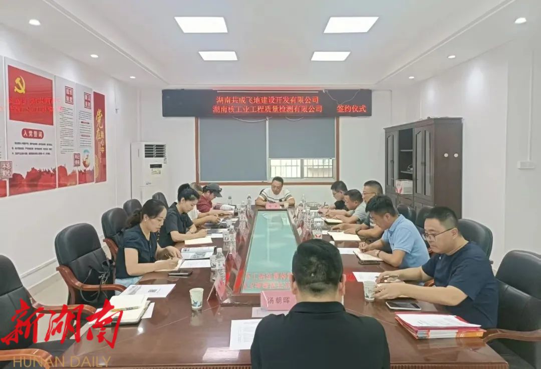 签约仪式上,湖南共成飞地建设开发有限公司负责人与湖南省核工业工程质量检测有限公司负责人代表双方落笔签约。