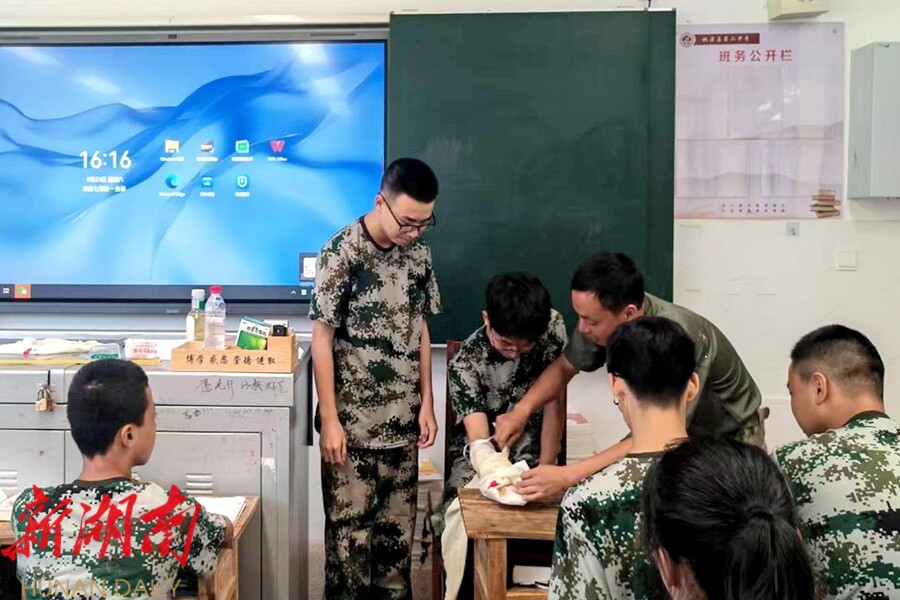 视外桃源客户端8月25日讯(通讯员: 马一凡 张艺瀚 陈艳 ) 8月23日下午,桃源县第二中学在高一新生军训中开展了一场别开生面的急救技能培训。1400余名新生在桃源县人民武装部教官的指导下,学习了创伤包扎、中暑与骨折处理等应急救护技能,实现了军事素养与生命安全能力的双提升。