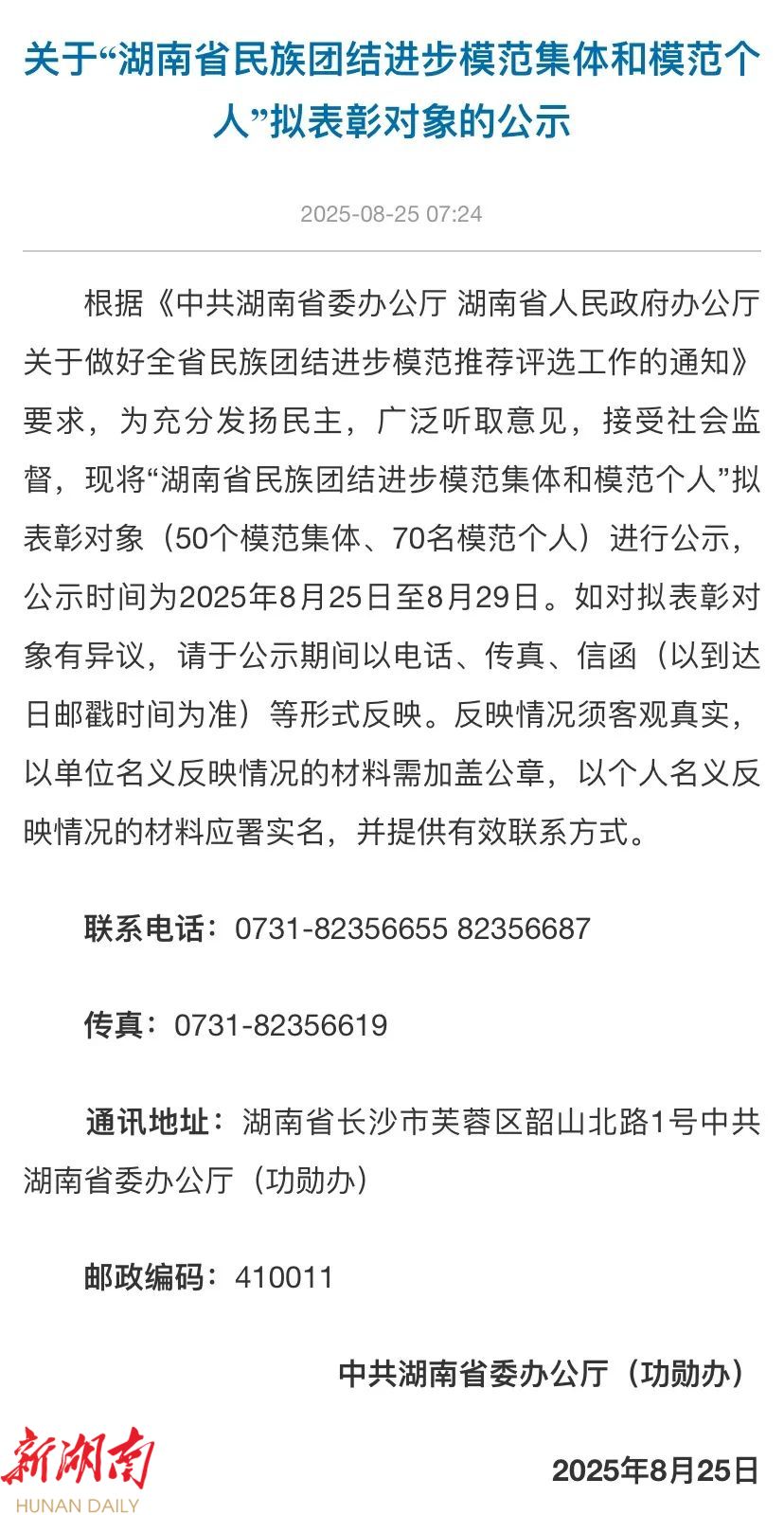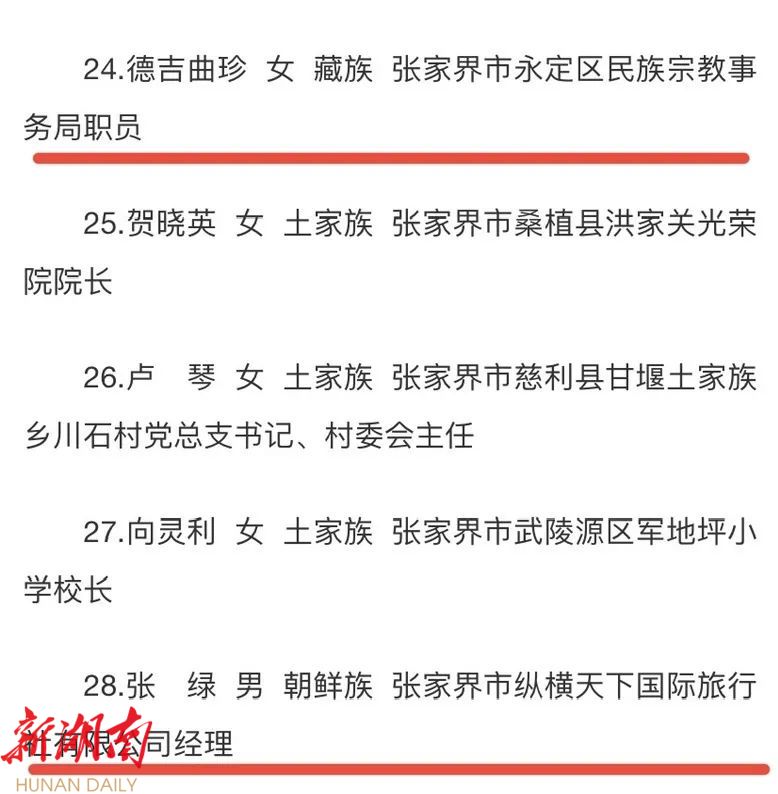 8月25日,湖南省委办公厅(功勋办)发布了关于湖南省民族团结进步模范集体和模范个人拟表彰对象的公示,其中张家界市永定区湘鄂川黔革命根据地纪念馆拟获湖南省民族团结进步模范集体称号, 张家界市永定区民族宗教事务局职员德吉曲珍、 张家界市纵横天下国际旅行社有限公司经理张绿拟获湖南省民族团结进步模范个人称号 。