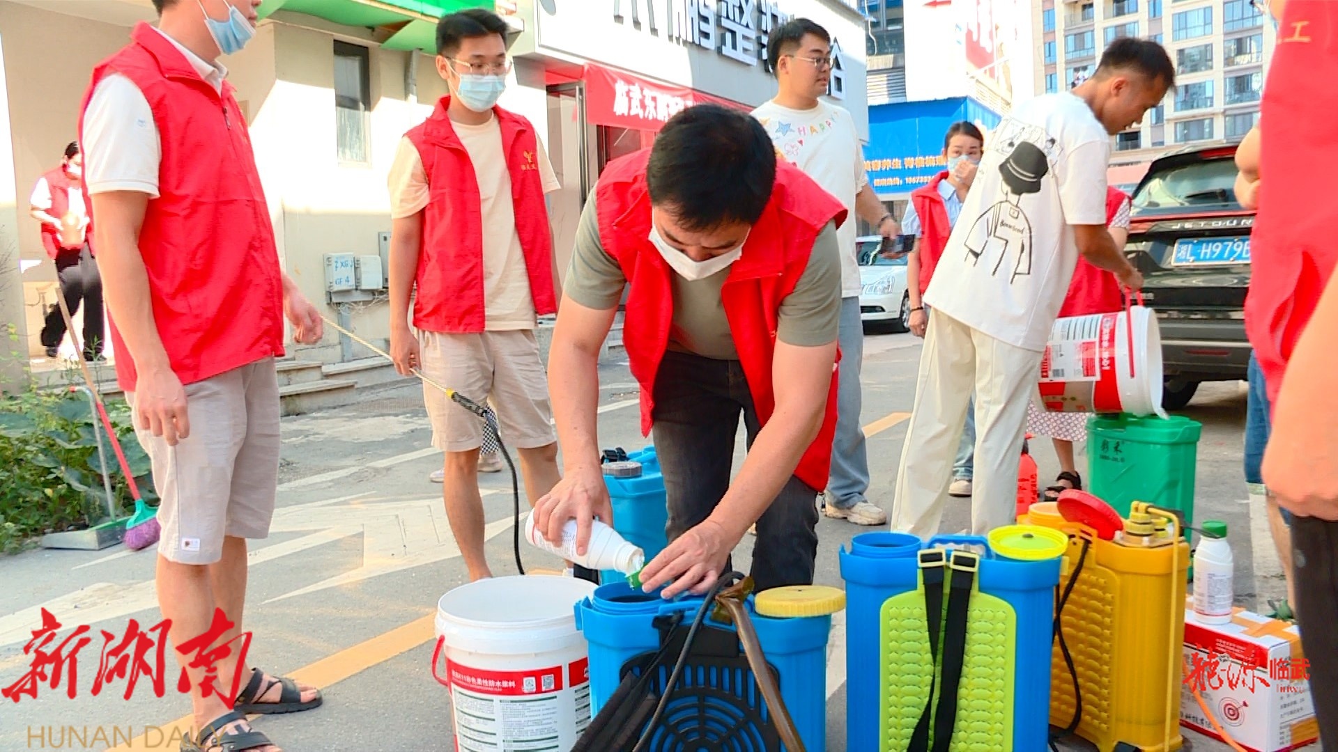 在中欣国际商品博览城中心区域,社区工作人员和义工将灭蚊虫药物稀释调和后装入喷洒器具当中。工作人员分成多个小组沿内部道路展开消杀,重点对绿化带、下水道口、垃圾池等蚊虫易孳生区域进行均匀喷洒,确保全覆盖、不留死角,从源头上有效遏制蚊虫繁殖。