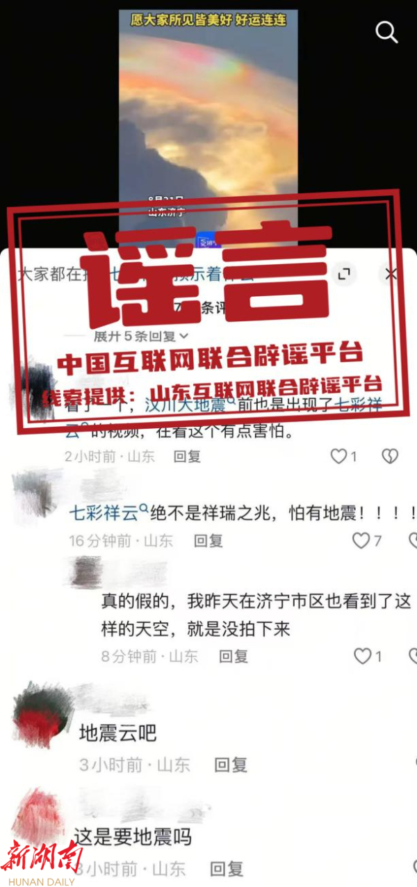 针对这些网络传言,济宁市防震减灾中心表示,所谓的“地震云”只是通常所说的高积云、层积云或是卷积云,科学研究未找到确凿的证据来证明其与地震存在关联,将所谓“地震云”作为地震前兆毫无科学依据。气象专家则表示,近日济宁出现的“祥云”在气象学上通常被称为“虹彩云”,是一种正常的大气光学现象,公众无需恐慌。