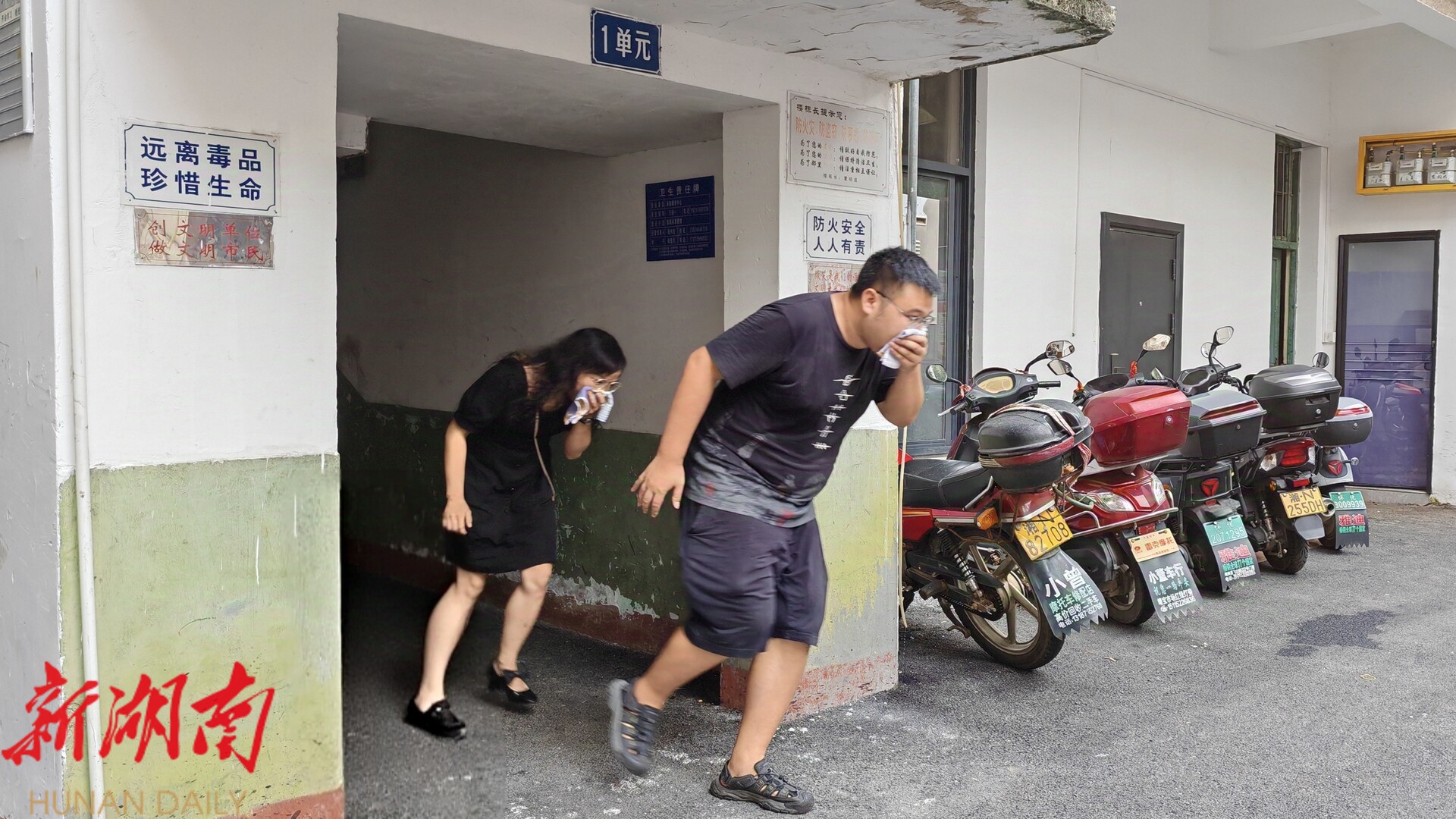 消防演练中,职工弯腰、捂住口鼻有序撤离(蒲湘萍 摄)