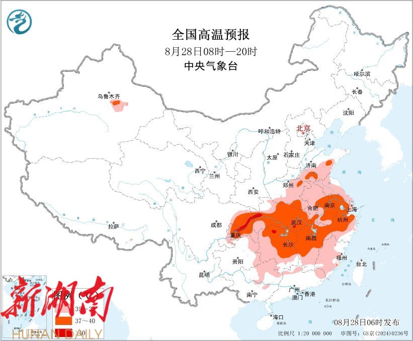 预计8月28日白天,新疆吐鲁番盆地、山东中南部、河南东部和南部、安徽、江苏、上海、湖北、湖南、江西、浙江大部、福建大部、四川盆地东部、重庆、贵州东部、广西东北部、广东北部等地有35℃以上高温天气 ,其中,山东中南部、河南东部和南部、苏皖南部、湖北大部、湖南中北部、江西中北部、浙江北部、四川盆地东北部、重庆中北部等地部分地区最高气温37~39℃ ,重庆中北部、湖南西北部等地局地可达40℃以上 。