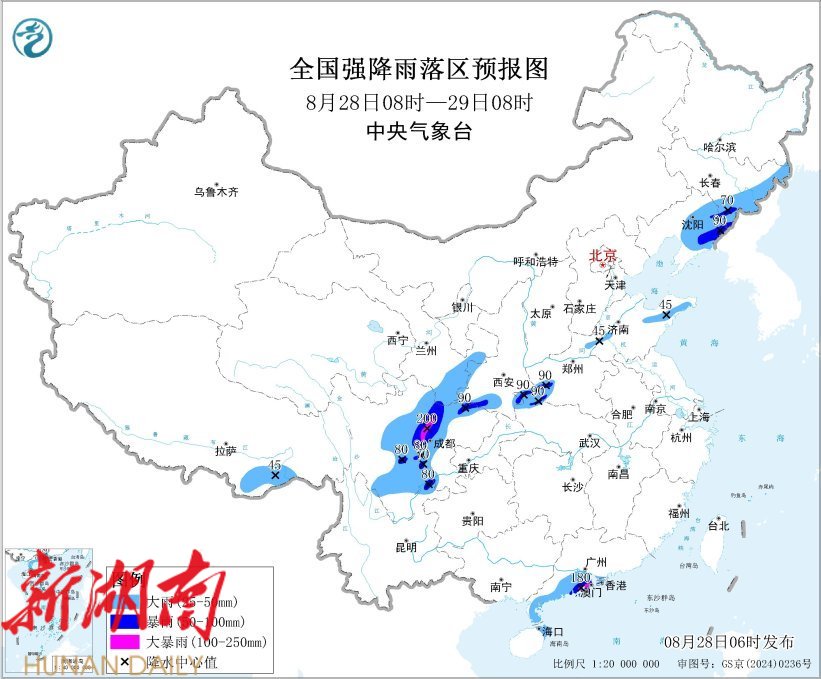 预计,8月28日08时至29日08时,吉林东部、辽宁中东部、西藏东南部、甘肃东部和南部、陕西中南部、山东中北部、河南西部、湖北西北部、川西高原、四川盆地西部和南部、云南东北部、广东中西部等地部分地区有大到暴雨 ,其中,四川盆地西部、广东西南部沿海等地局地有大暴雨 (100~200毫米)。上述部分地区伴有短时强降水 (最大小时降雨量20~50毫米,局地可超过70毫米),局地有雷暴大风等强对流天气 。