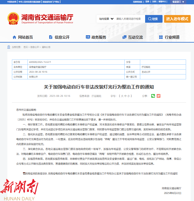 不少人想必都有这样的经历:在夜间被迎面驶来的“强光小电驴”照得睁不开眼!对此,湖南省交通运输厅发布最新通知,全面加强对电动自行车非法改装灯光行为的整治 。