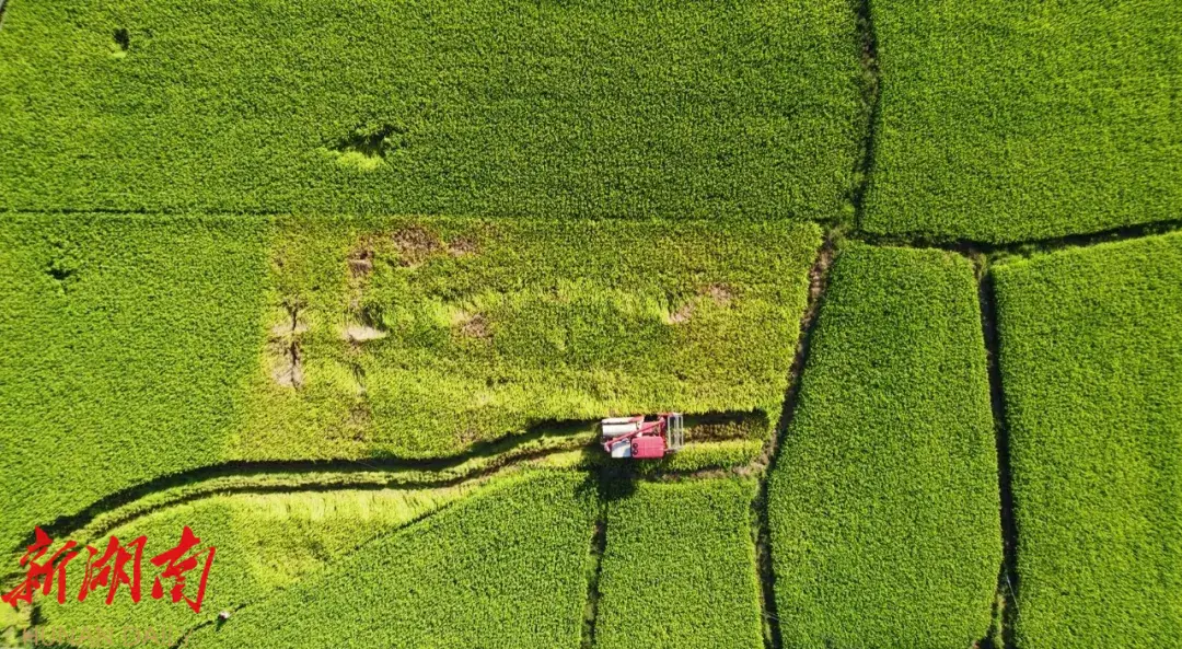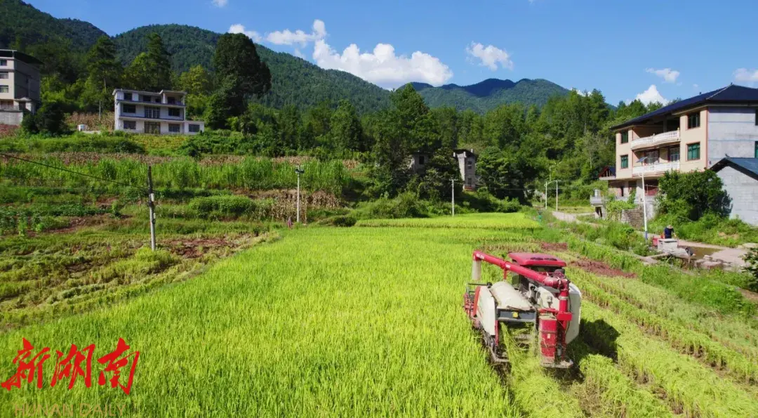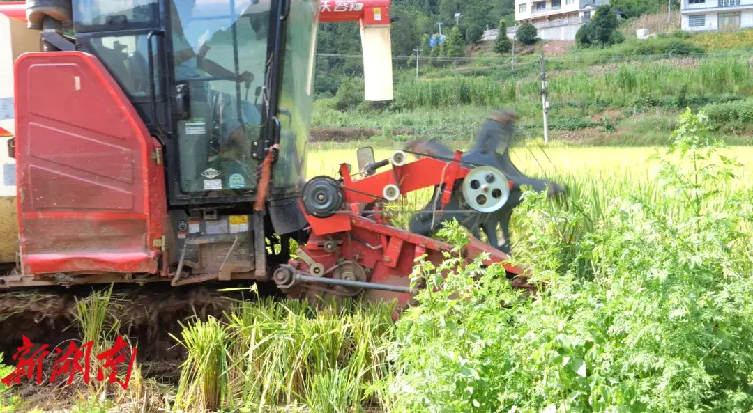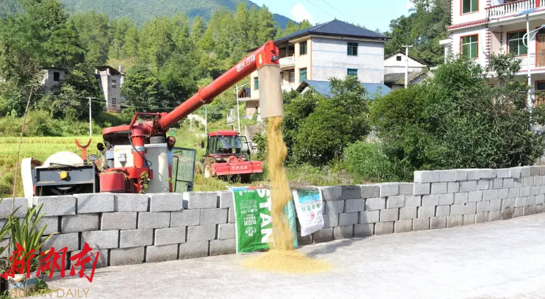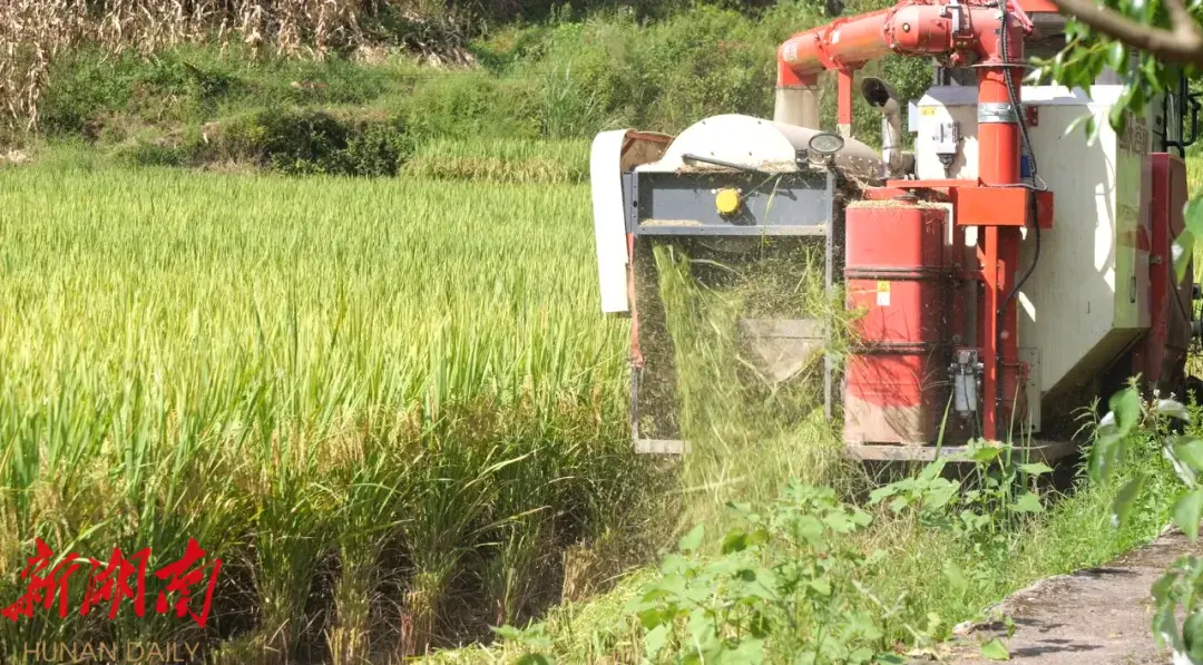 湖南日报·新湖南客户端8月29日讯 (通讯员 郭军 庄丹丹 谷蕊眩 )8月27日,桥自弯镇谷罗山村连片稻田金黄遍野,稻浪翻滚。轰鸣的收割机在田间来回穿梭,谷罗山水稻种植专业合作社的农机手正娴熟地操作机器,将沉甸甸的稻穗收入舱中。“现在收割、打药全都交给合作社,我们只需负责插秧和晾晒,方便得很!”得益于现在的机械化作业,今年63岁的谷罗山村民胡基华种植了近4亩的水稻。