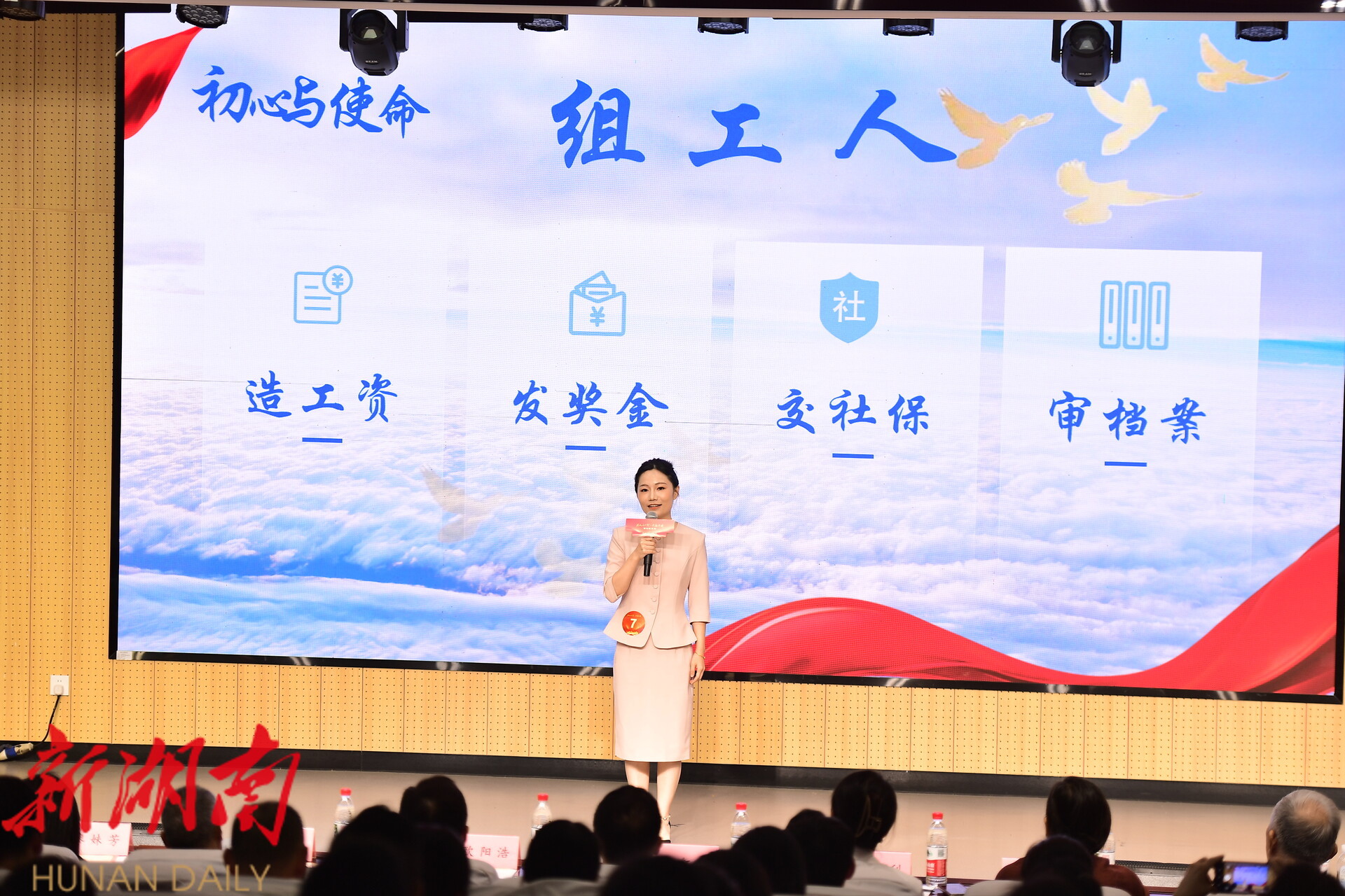“20克的材料能托住一个时代的稳稳幸福 —— 这是组工人的答案。”洪山管理局干部易佩韦的宣讲,让现场多了几分感动与敬意。“五年前,我遇到一位退休工人,他拿着40年前的工勤报名表,想补录5 年工龄。那张纸皱得像揉过的糖纸,字迹都快模糊了。” 易佩韦说,为了帮老人圆梦,她跑遍档案馆、社保局,查政策、核记录,最终帮老人补全了工龄。还有一次,她把一张高铁票撕成两半,一半送先生去深圳参与基因库建设,一半自己钻进湘西山区调研基层党建,“组工人的KPI不是表格上的数字,是老百姓生活里的新可能。” 讲到这里,她声音微微颤抖,台下响起热烈掌声,有观众轻声感叹:“原来平凡岗位上,藏着这么多温暖的坚守。”