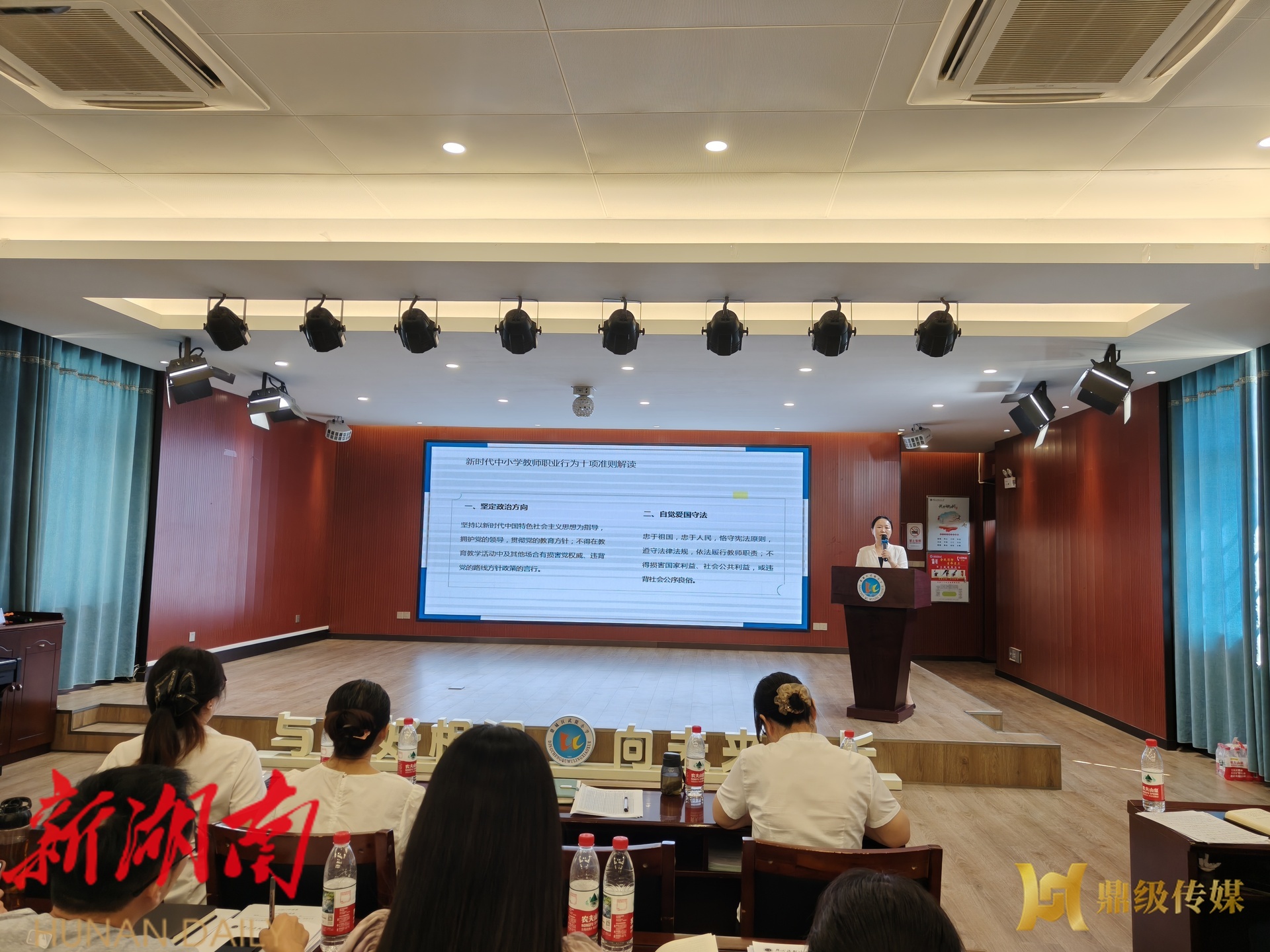 培训中,全体教师学习了《新时代中小学教师职业行为十项准则》《中小学教师违反职业道德行为处理办法》等规章制度,还通报了近年来全国及本地教育系统查处的师德失范典型案例,大家边听边记,在笔记本上标注重点内容,对自身职业行为的规范意识进一步增强。