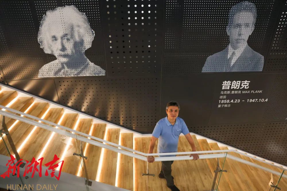 彭承志在科大国盾量子技术有限公司楼梯前留影。图源:新华社