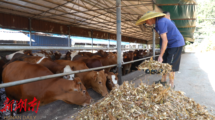 合通畜牧养殖专业合作社是洞口县“一中心四网点”秸秆收储体系的对接企业之一。目前该社存栏肉牛450多头,依托周边村庄丰富的秸秆资源,构建起“收集-加工-利用”闭环生产模式。合作社定期向村民收购玉米、水稻、花生等农作物秸秆,通过粉碎、发酵、储存等科学处理方式,将其转化为肉牛的优质饲料。今年以来,该合作社已收购加工秸秆2700余吨。