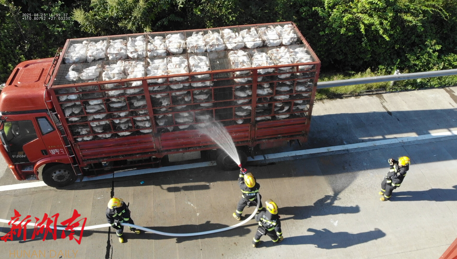 沪昆高速洞口段近两千只鹅高温“中暑” 消防紧急“补水降温”