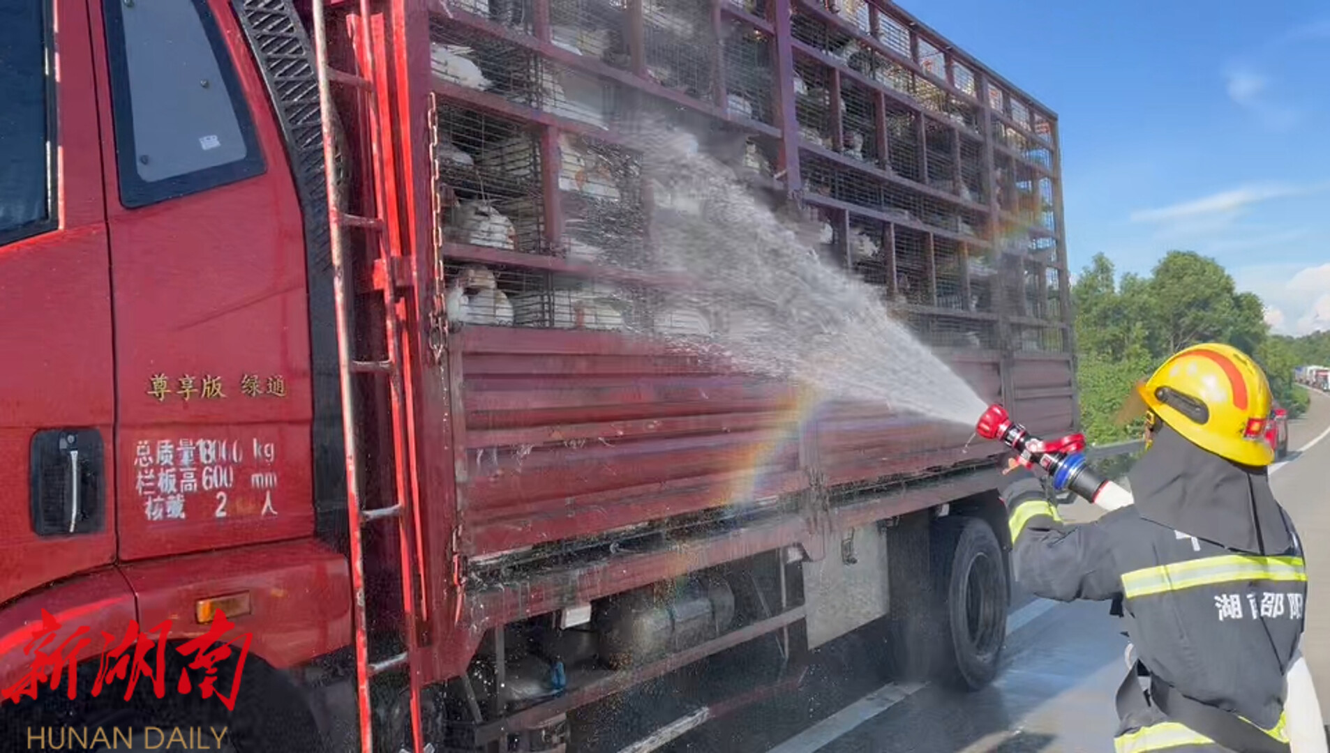 接到驾驶员报警后,洞口县消防救援大队紧急调派雪峰站1车7人赶赴现场。消防救援人员抵达现场后发现,由于持续高温和阳光照射,运输车车厢被炙烤得发烫,栏板内的鹅群挤作一团,不少大鹅伸长脖子呼吸急促。在现场指挥员一声令下,消防救援人员们分为两组,一组在车辆后方铺设交通锥,临时指挥交通,另一组利用高压水枪环绕货车为鹅群降温,经过半个多小时的持续浇水,鹅群的状态明显得到好转。