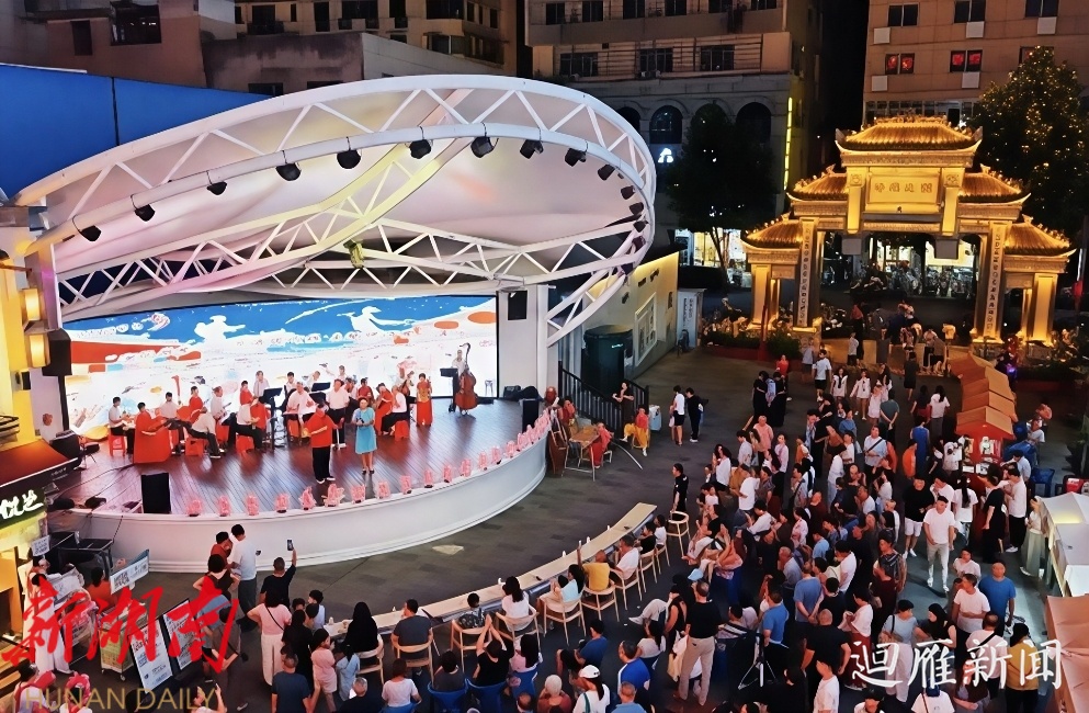 市府路商圈化身“非遗欢乐场”,一场非遗文艺演出在民俗文化广场拉开序幕。民乐合奏《精忠报国》奏响节日序曲,歌伴舞《衡阳是个好地方》唱出家乡风情,花鼓戏《补锅》《刘海砍樵》等经典节目轮番登场,杂技与变脸表演更添趣味,台下掌声欢呼声此起彼伏。商圈内,《鹊桥迷踪》剧本游、爱情盲盒墙与“多巴胺实验室”成了单身男女邂逅良缘的热门地,商铺间人流涌动,美食摊前香气四溢,热闹的氛围让整个商圈成了欢乐的海洋。