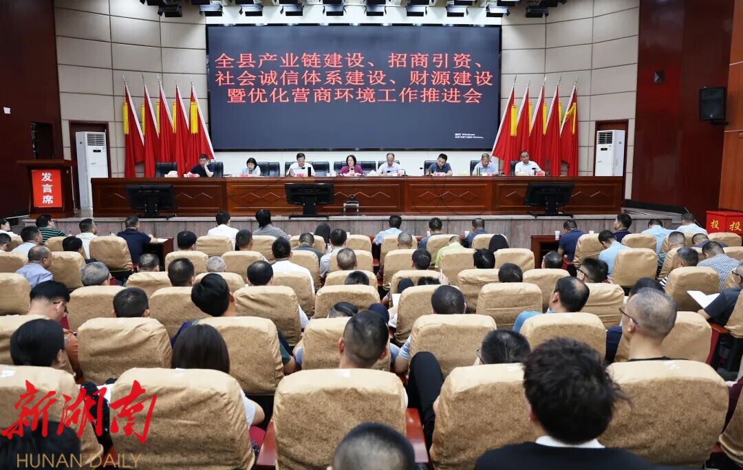 新新邵客户端8月29日讯(记者 何雯 赵少波)8月28日下午,新邵县召开招商引资、产业链建设、优化营商环境、社会诚信体系建设、财源建设、巩固拓展脱贫攻坚成果同乡村振兴有效衔接考核反馈问题整改等工作推进会,深入贯彻落实省、市相关会议精神,分析当前形势,部署相关工作任务。县委书记黄海蓉出席并讲话,县委副书记、县长谢小军主持,县委副书记、统战部部长王振波,县领导贺雄、刘丹、李繁荣、蒋命贤、彭利等出席。