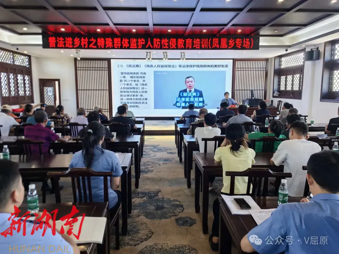 湖南日报·新湖南客户端9月1日讯(通讯员:谢伟)8月29日上午,凤凰乡联合区人民检察院开展“普法进乡村之特殊群体监护人防性侵教育培训”活动。区人民检察院党组书记、检察长吴俊霖、凤凰乡主要负责人出席,全乡40余名特殊人群监护人参加培训。