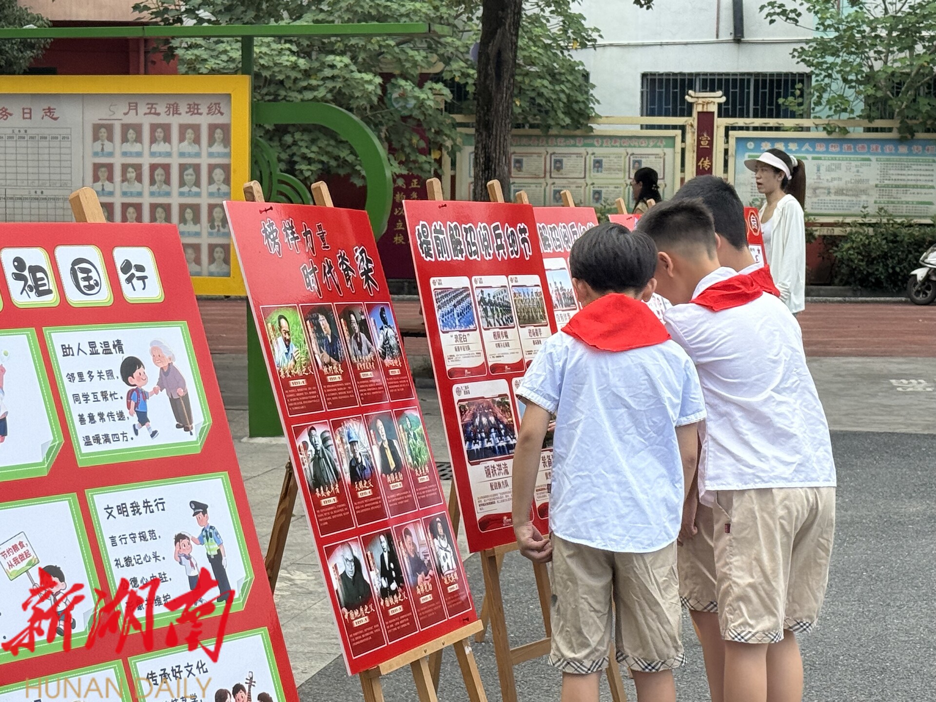 清晨的校园处处充满着朝气与活力,各学校也精心布置了校园环境,以崭新的面貌欢迎孩子们返校。在县芙蓉完小,学校围绕“抗战精神点燃新学期斗志”主线,通过精心设计的主题展板,展示祖国重大事件、榜样的力量及时代楷模事迹等内容,将迎新活动与抗战历史深度融合,引导孩子们铭记历史、珍爱和平,在潜移默化中厚植爱国情怀。
