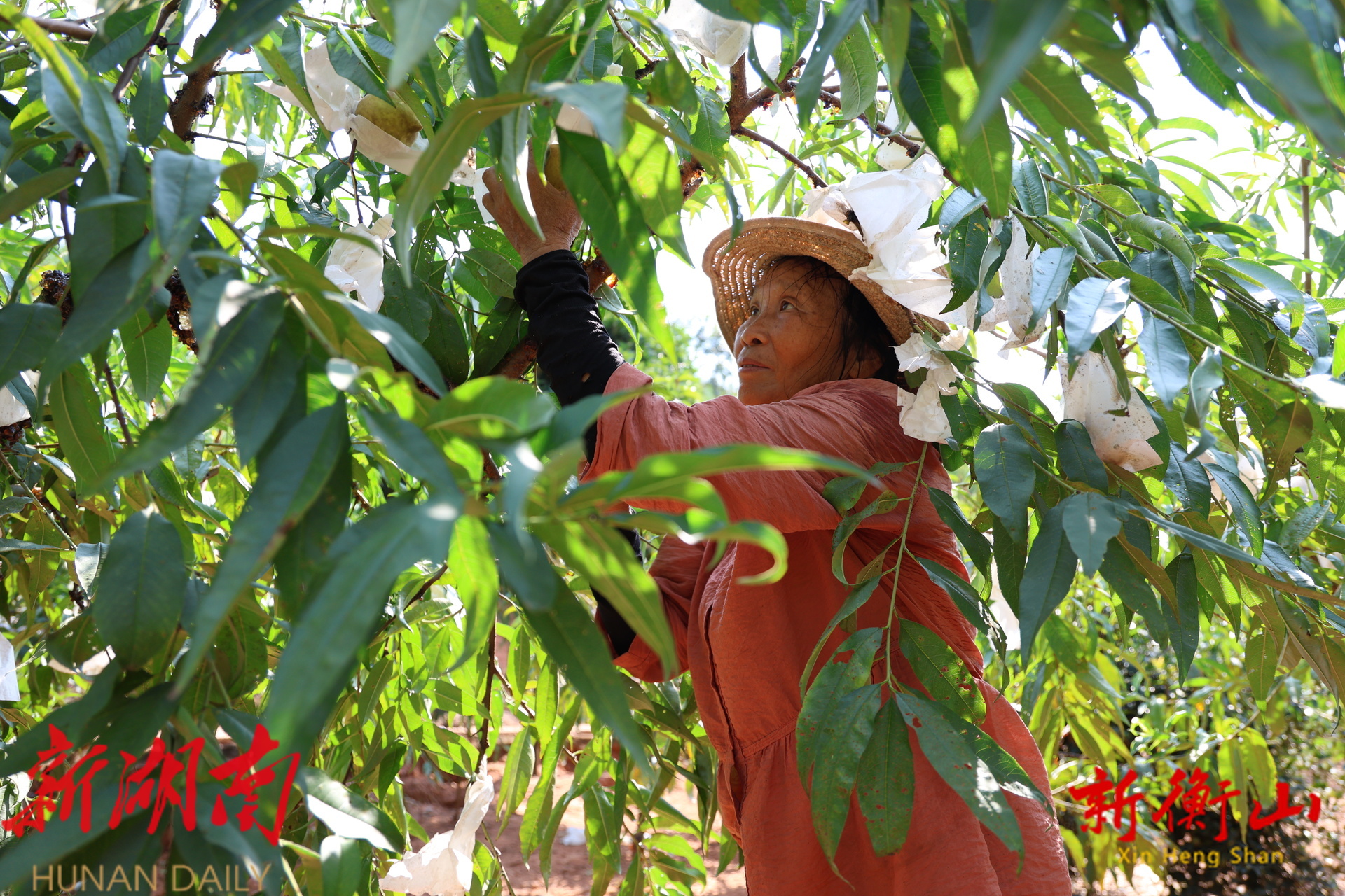 走进果园,沉甸甸的果实挂满枝头,压弯了树枝。果农们穿梭其中,熟练地撕开白色“外衣”,将一颗颗饱满的菁香桃摘下,放入篮筐。