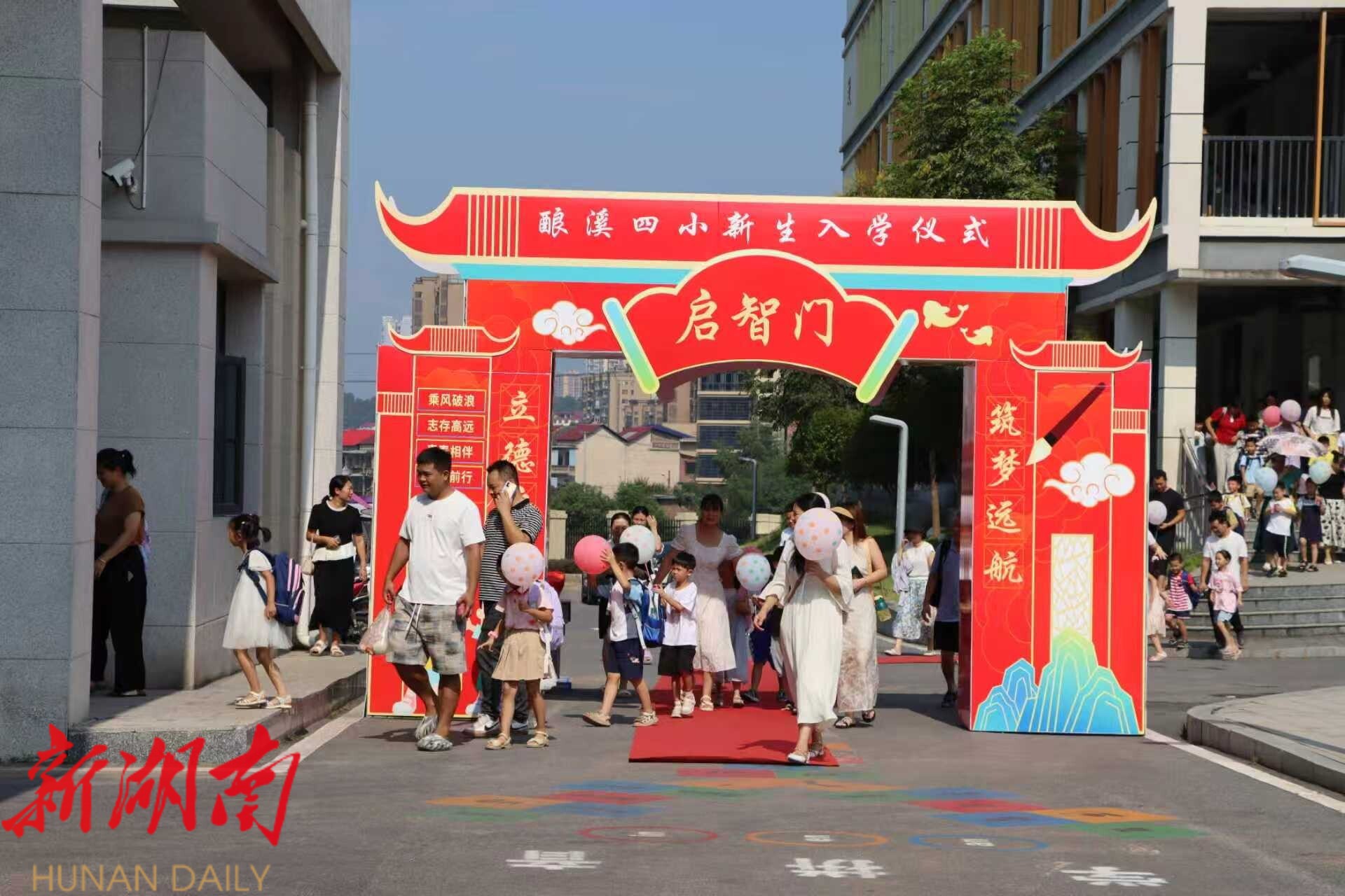 清晨,校园里一片欢声笑语。学校特别设置的“启智门”下,一年级新生们在老师和家长的陪伴下,怀着好奇与憧憬,迈着轻快的步伐依次穿过。这一寓意着开启智慧之门的环节,象征着孩子们正式踏上了求学之路。