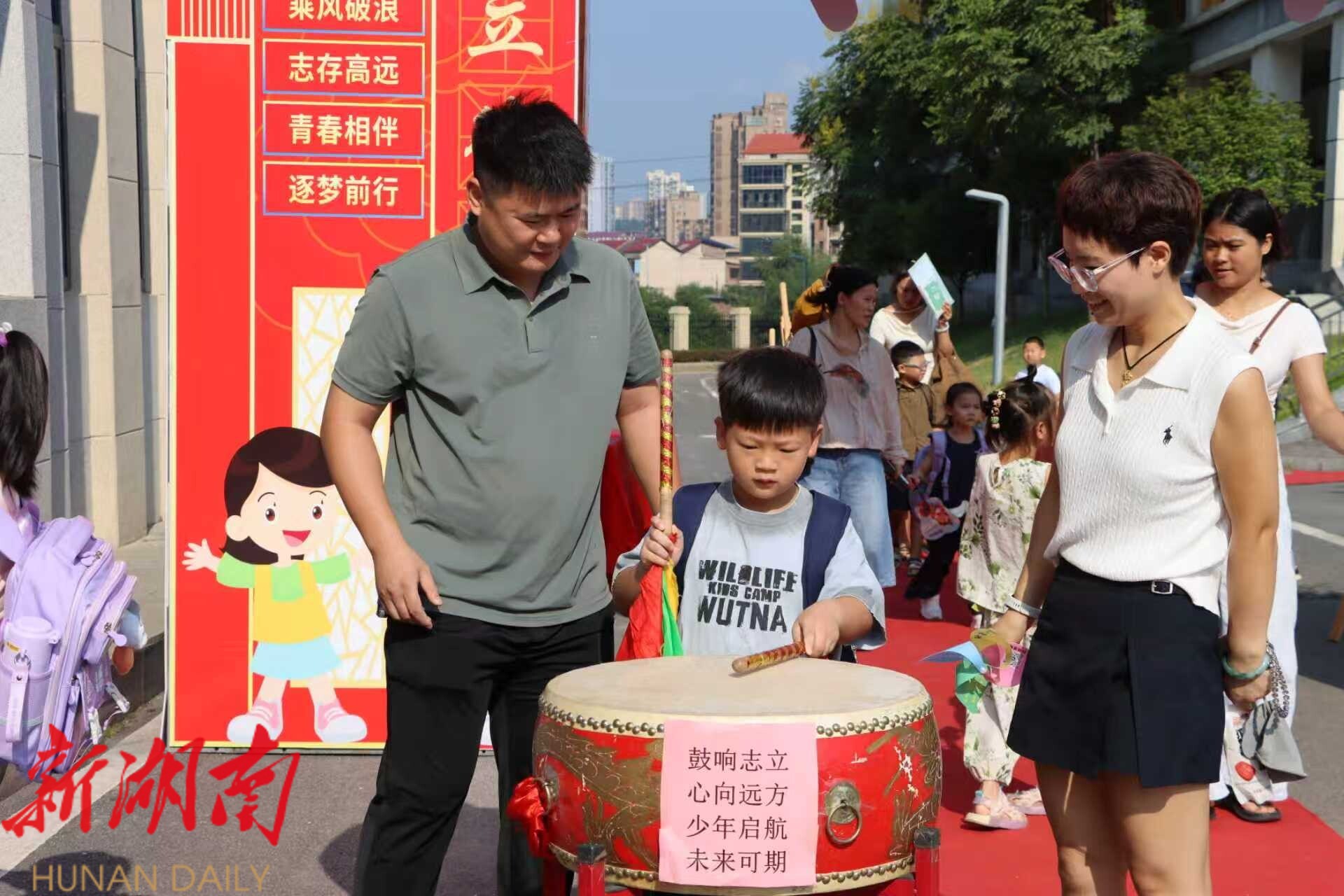 “咚咚咚……”紧接着,激昂的鼓声响起。孩子们饶有兴致地来到大鼓前,奋力击鼓。每一声响亮的鼓声都代表着他们的志向,希望通过新学期努力奋进,追逐梦想。