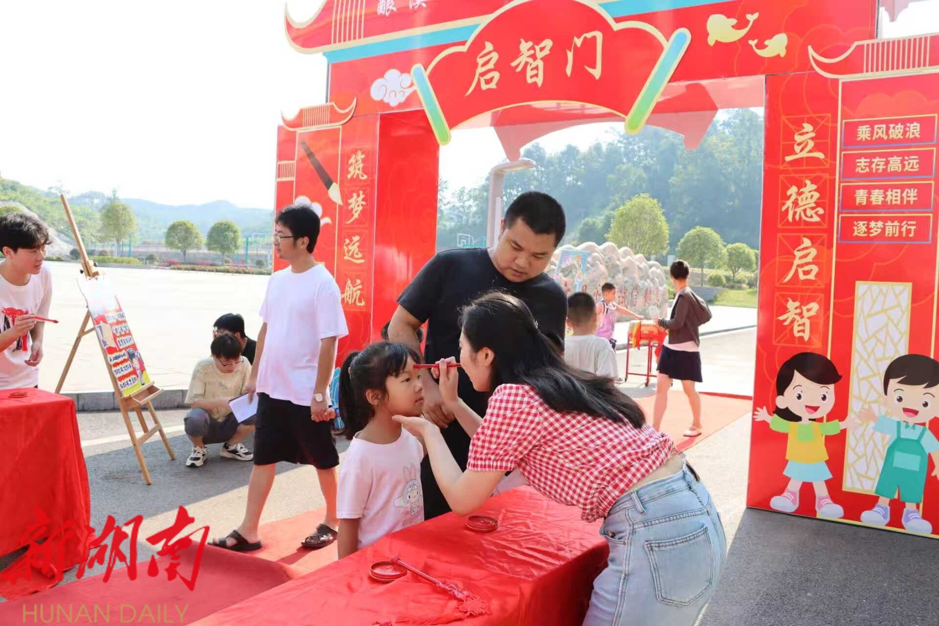 “启智门”后,一场庄重的“朱砂启智”仪式正在进行。学校领导和老师们手持毛笔,蘸上朱砂,轻轻点在孩子们的额头正中央。一颗颗鲜艳的红痣,寄托着对孩子们“眼明心亮、聪慧进取”的美好祝愿,更承载着深厚的文化内涵与殷切期望。