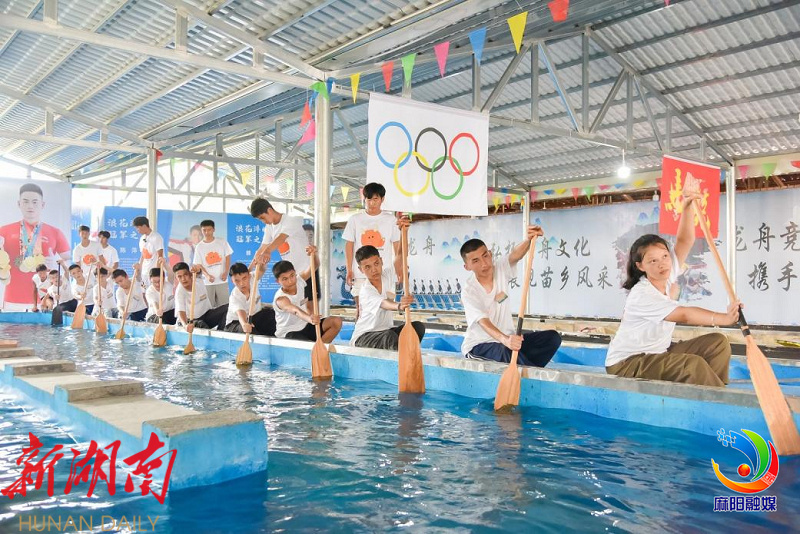 营员们在麻阳水上运动学校学习划龙舟技巧