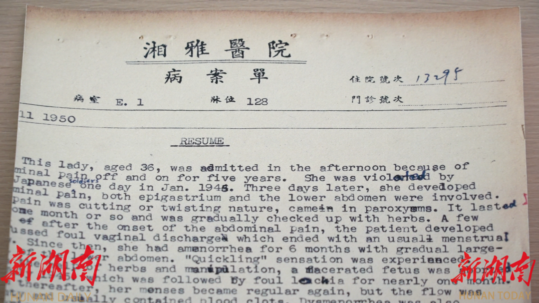 自1944年6月长沙沦陷,至1945年9月,长沙一直在日军的控制之下。当时,熊女士是一名小学老师,尚未结婚。“1945年1月的一天,两名日军士兵对她实施了性侵犯。”中南大学湘雅医学院副院长黄耿文介绍,病历详细记录了受害者此后5年间的痛苦历程。“患者遭受侵犯前身体健康,但被侵犯3天后便出现刀割般的腹痛,并且伴有痉挛性的加重。更不幸的是,一个月后发现怀孕,试图进行堕胎一直未成功,直到在被侵犯半年后,多次采取中药治疗和中医手法堕胎才得以成功。”之后,患者每隔三四个月就发作一次腹痛。1949年9月后腹痛频率更高,每个月都发生,有时还伴有血尿,于是入院检查。