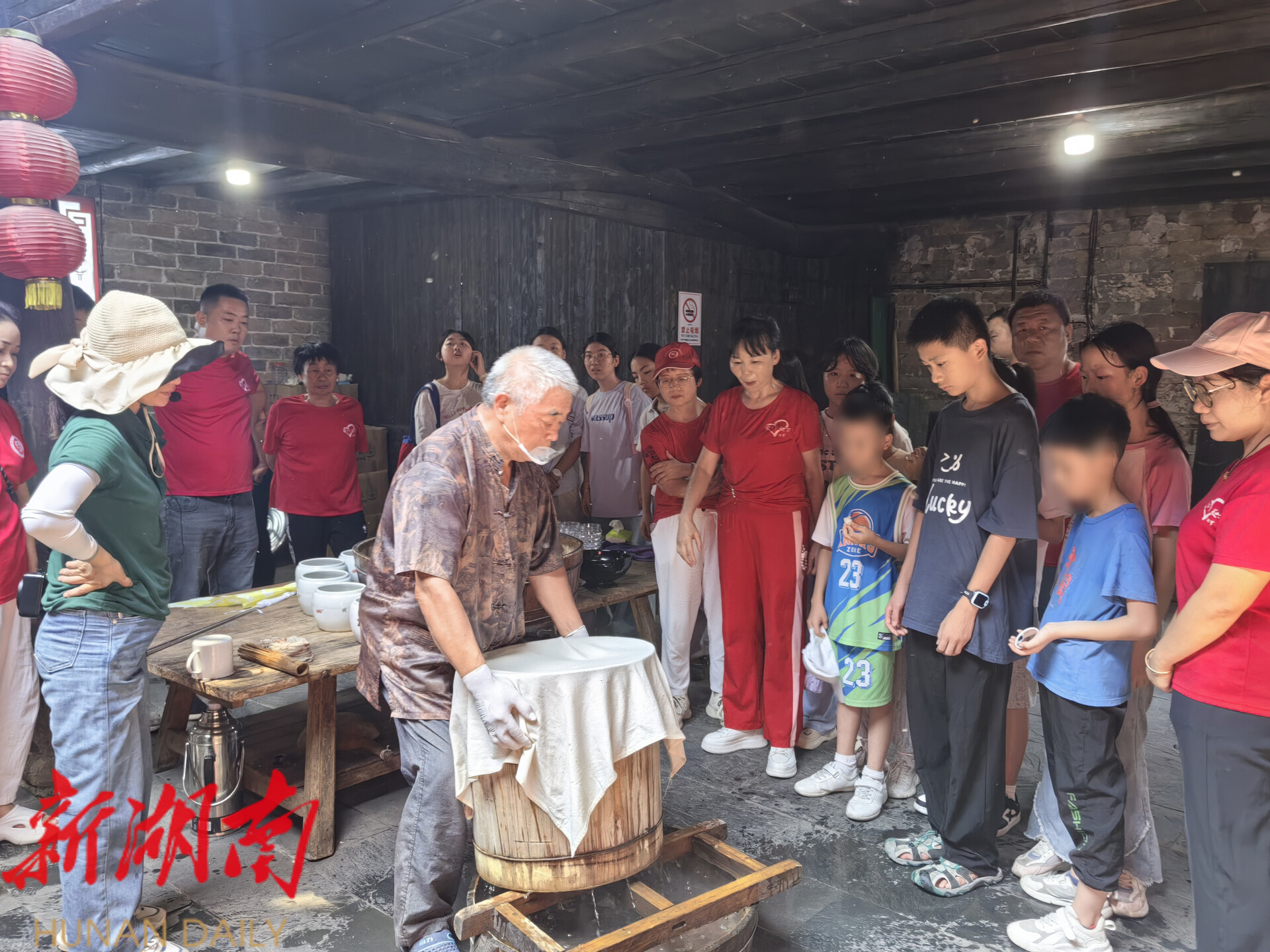 随后,团队一行前往长乐镇,沿麻石古街依次参观了熊记甜酒古法作坊、上市街故事文化博物馆等场所,近距离感受家乡非物质文化遗产的独特魅力。在大垅农耕文化博物馆,孩子们通过实物展陈与详细讲解,深入学习农业知识,增强了劳动观念和珍惜粮食的意识。