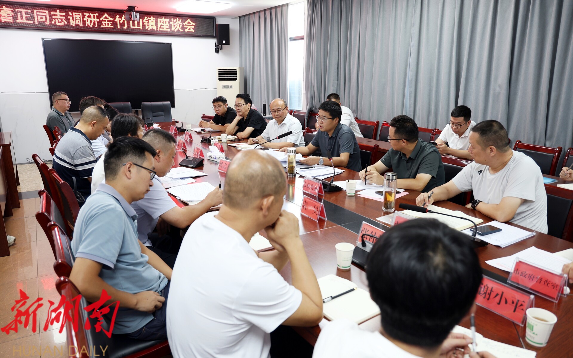 座谈会上,唐正听取了金竹山镇工作情况汇报。金竹山镇总面积27.8平方公里,煤炭、石灰石、粘土等矿产资源丰富,下辖7个行政村、6个居委会,在籍人口23237人,常住人口13592人。当前,该镇按 “一山一水一园区” 规划,依托“高速 + 高铁”交通优势,以“山”兴农、以“水”促旅,围绕打造“农文旅融合园区” 目标,推进以麻溪村为核心的“五村连片”乡村振兴示范点建设,着力打造特色资水文旅小镇。与会人员就推动镇域发展积极建言献策。