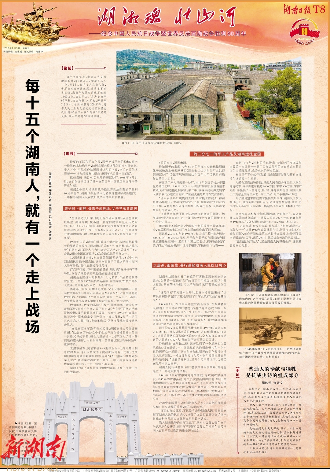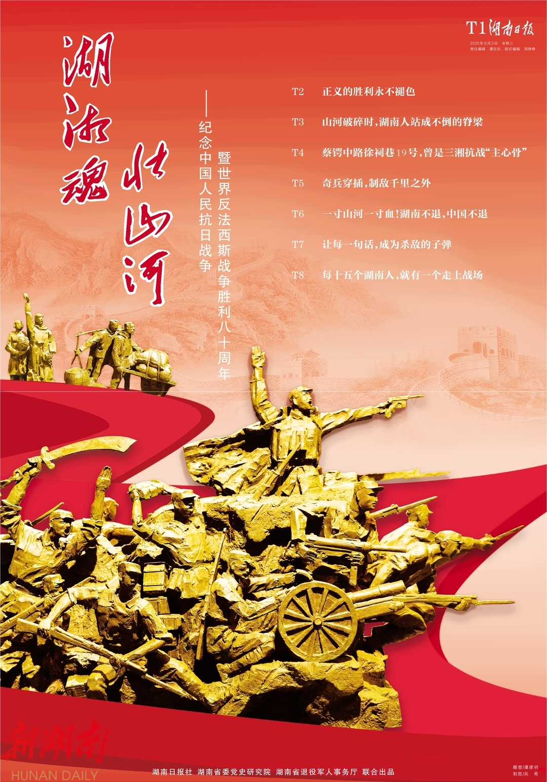 前事不忘后事之师,在纪念中国人民抗日战争暨世界反法西斯战争胜利80周年之际,《湖湘魂 壮山河》大型特刊以文字致敬先烈,以影像铭刻牺牲,让我们共同铭记历史所启示的伟大真理:正义必胜!和平必胜!人民必胜!