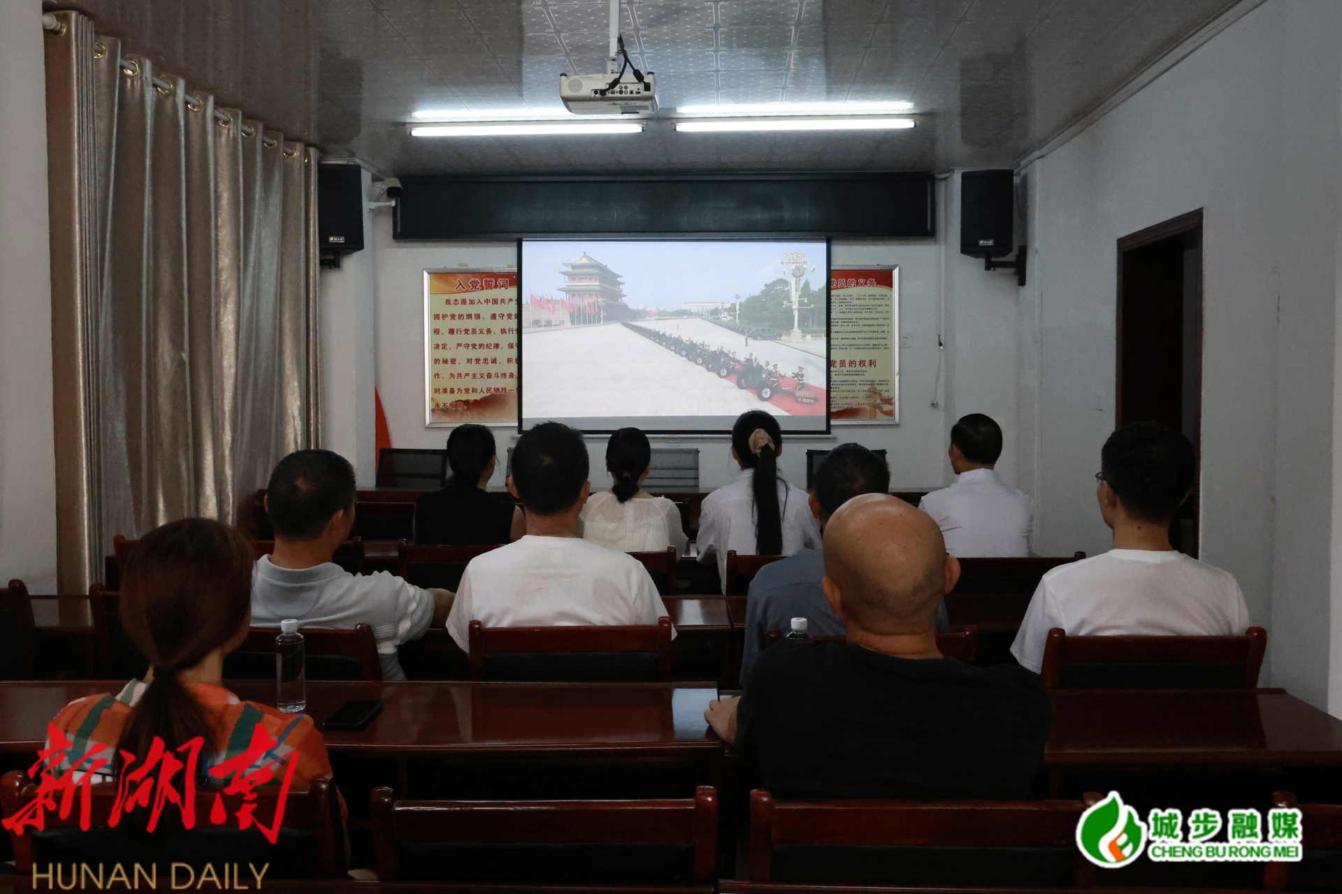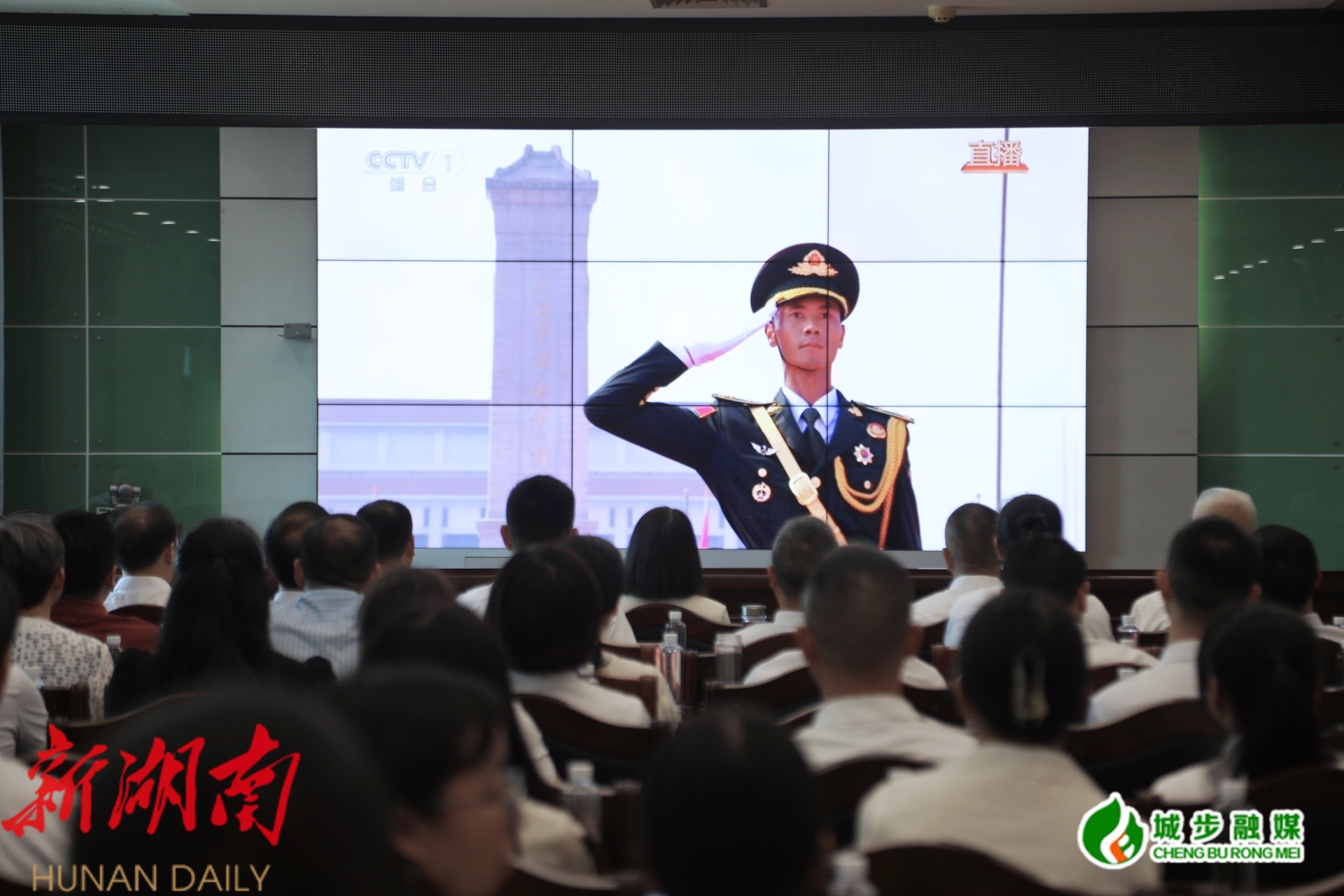 图为县融媒体中心干部职工收听收看纪念大会和阅兵仪式